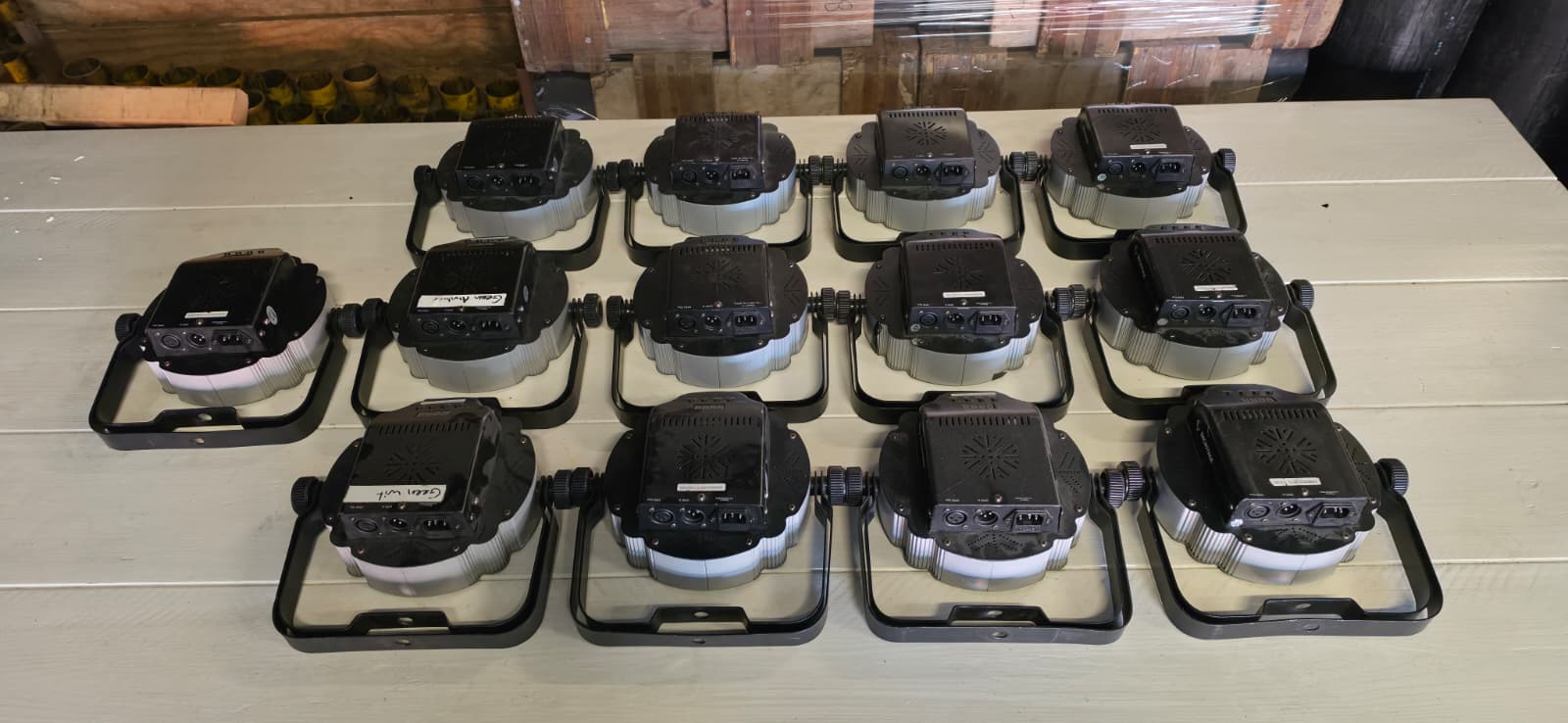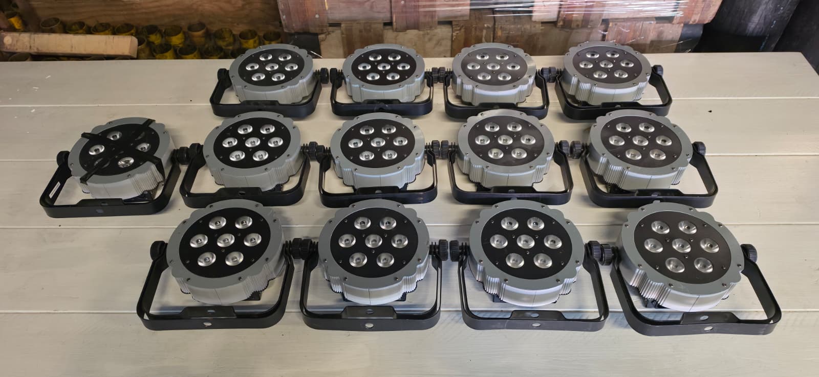 Aangeboden: een set Showtec Tri Par LED spots. In totaal zijn er 13 spots beschikbaar, waarvan 9 volledig werkend zijn. Deze spots produceren amber en wit licht, ideaal voor diverse evenementen en sferen. €375 voor de complete set