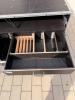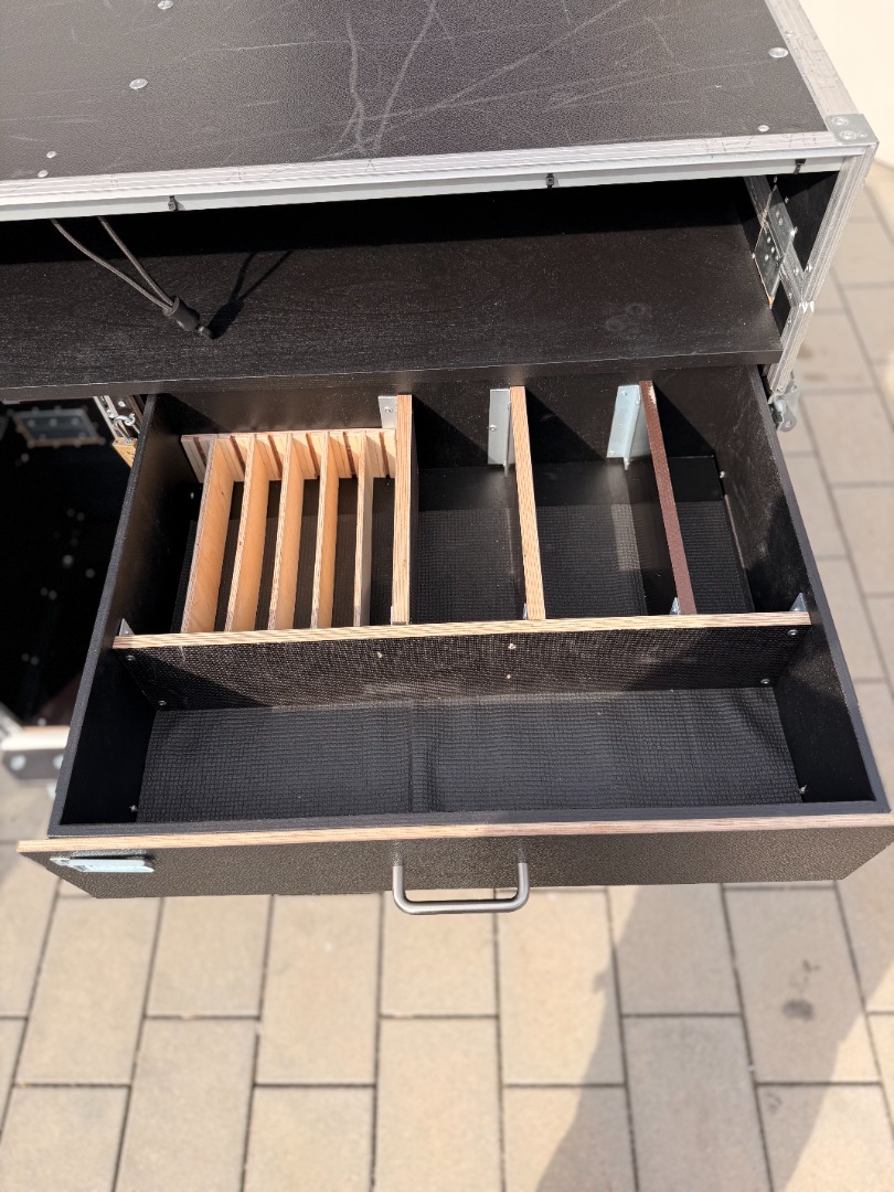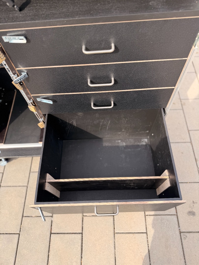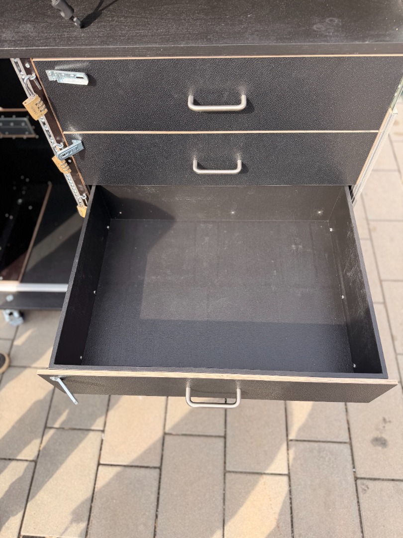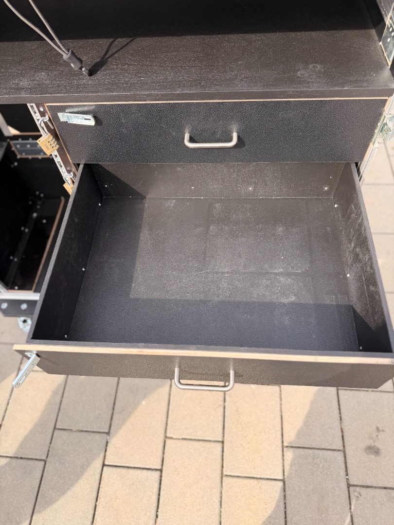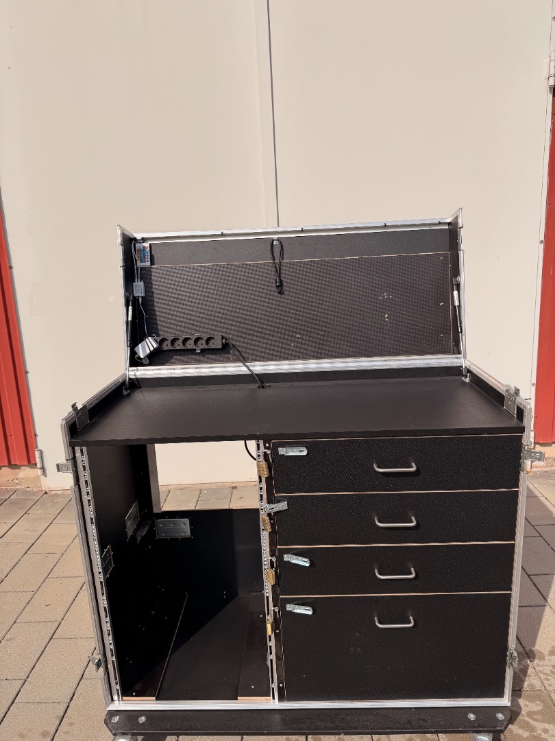 Es hat neben 4 Schubladen auch einen 19" Einbauschrank welches je nach Bedarf mit 19" Geräten oder Schubladen ausgesatttet werden kann.