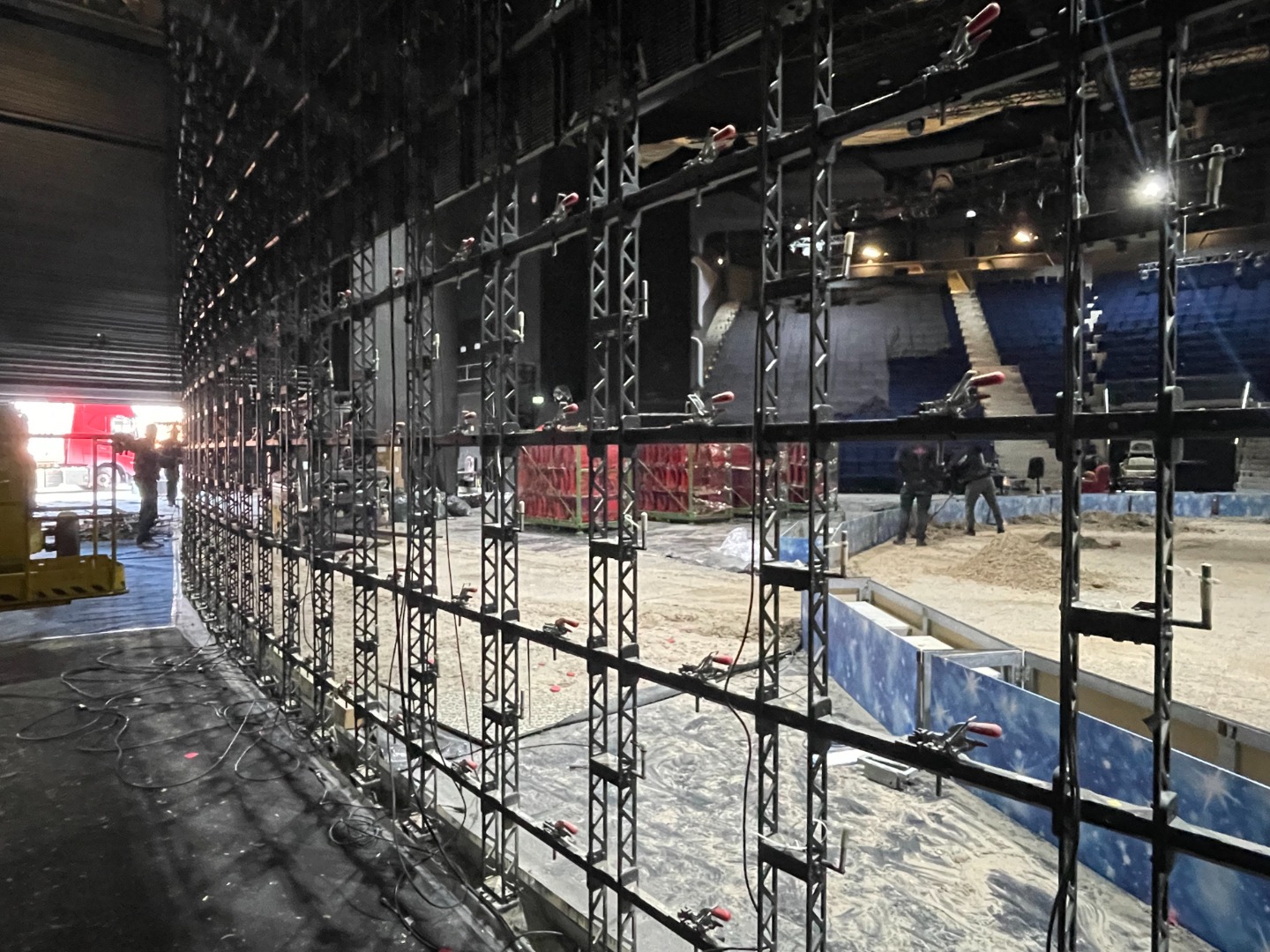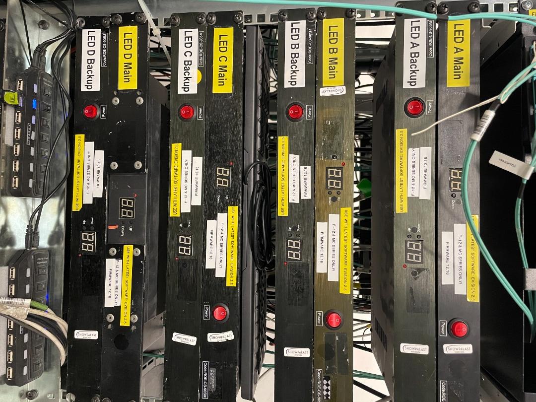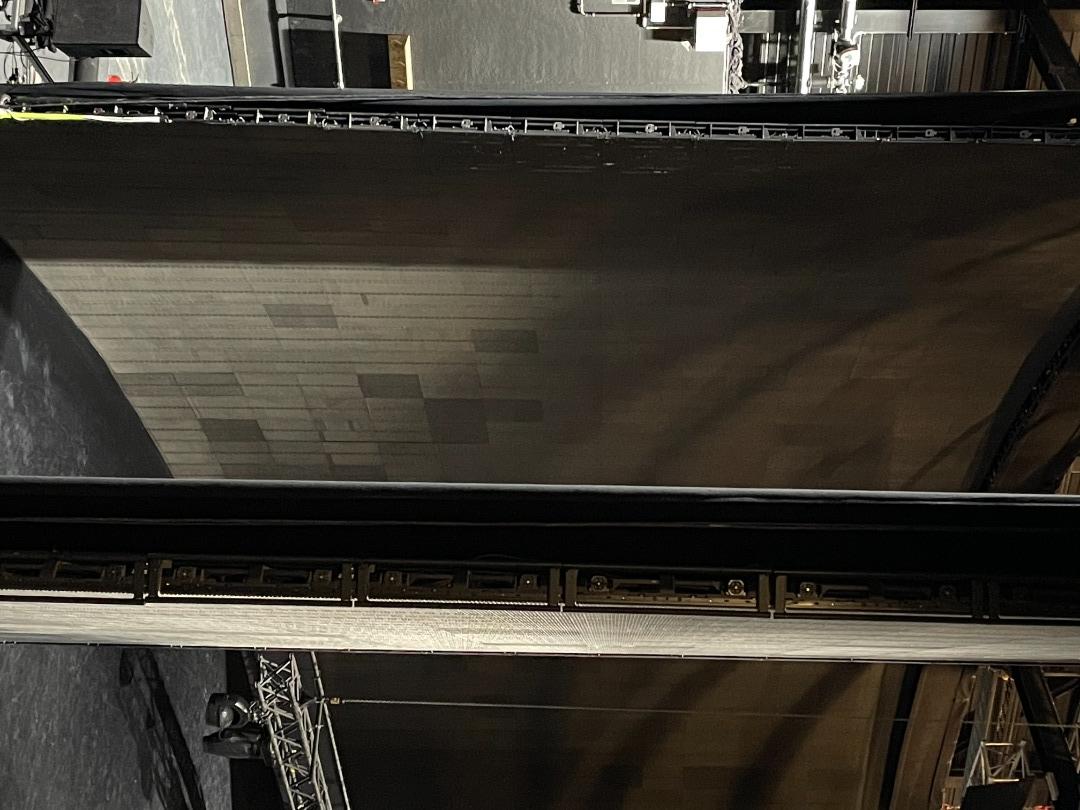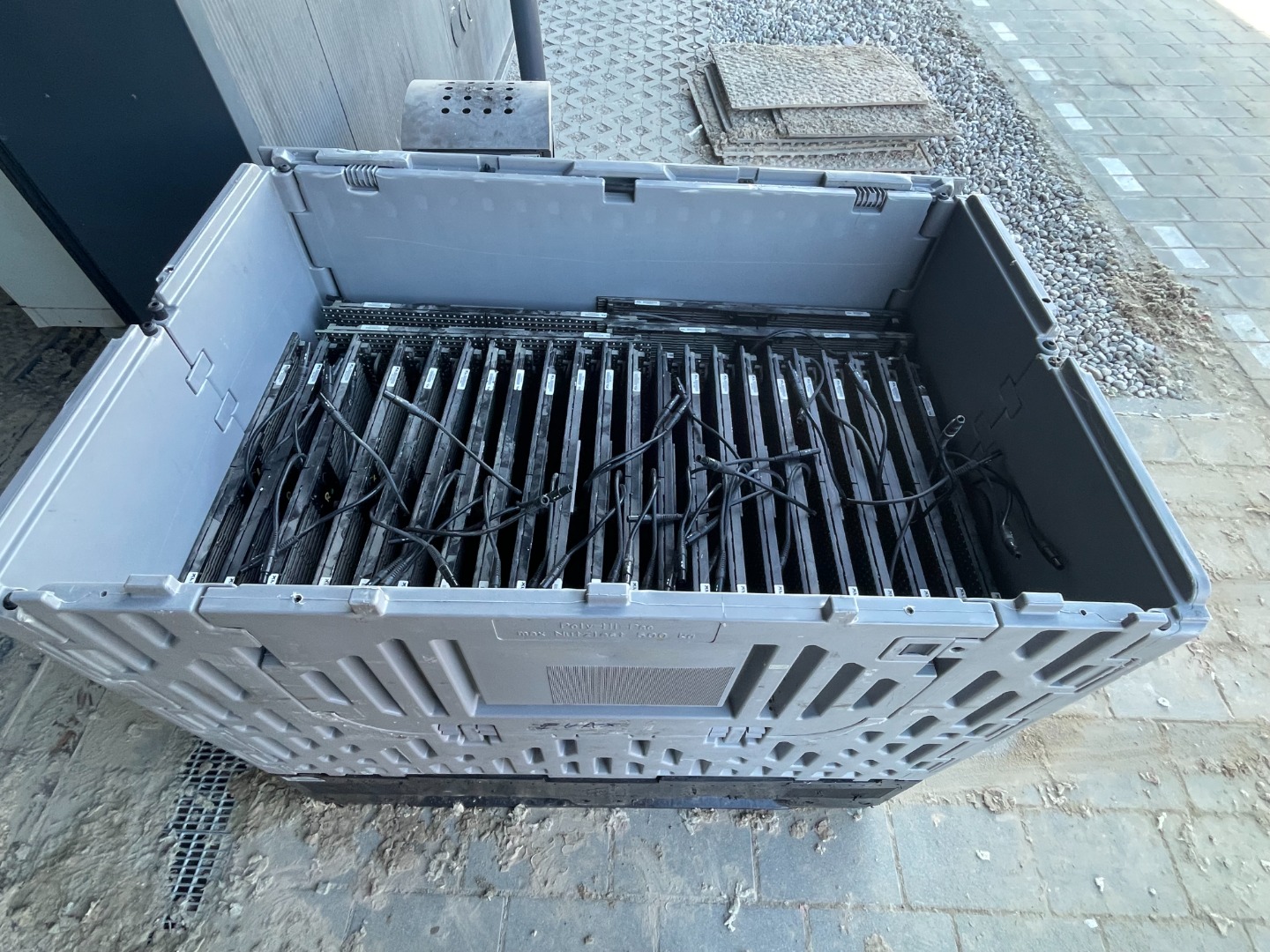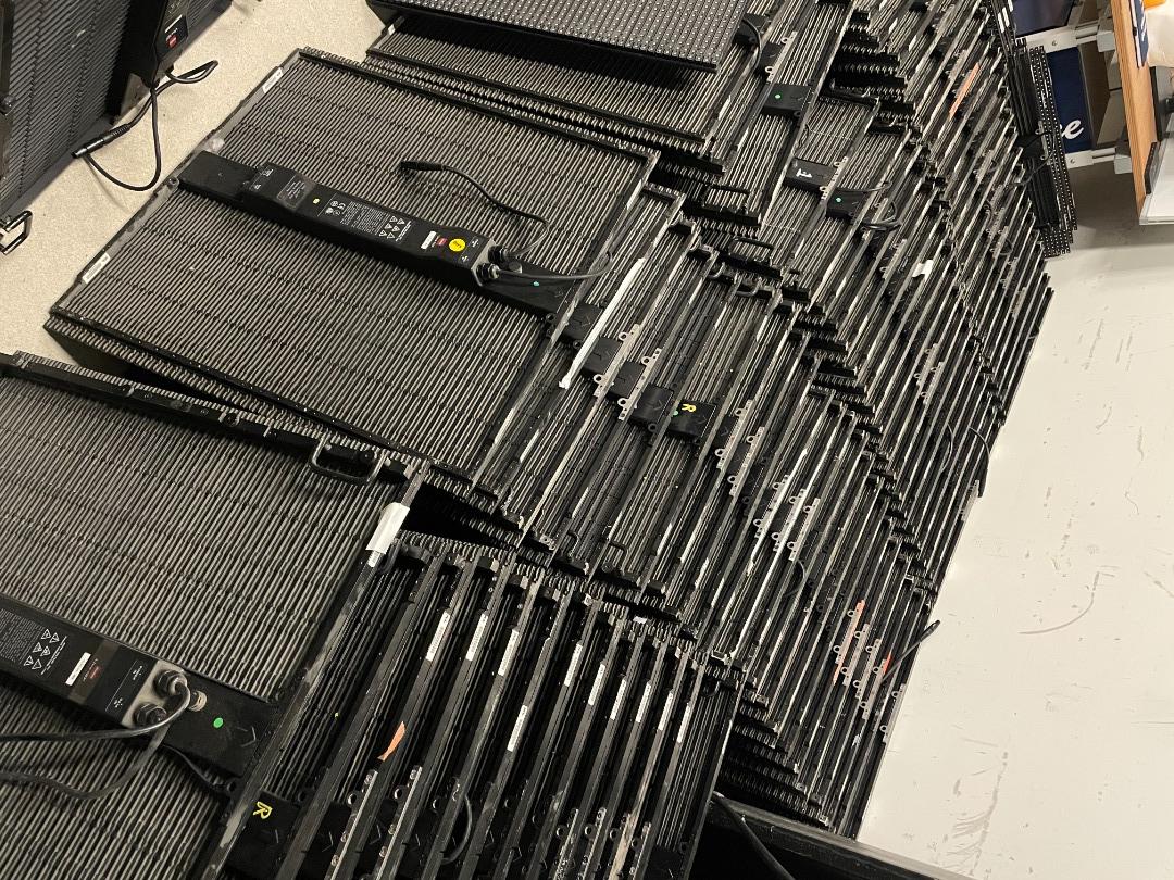 Die Wand ist mittlerweile abgebaut und die Panels in 50 Transport-Cases verstaut. Zudem ist alles restliche Material (Frames, Netzteile etc.) auf zwei 20ft-Container aufgeteilt verstaut. Alles ist also unmittelbar bereit zur Abholung und Verfrachtung.