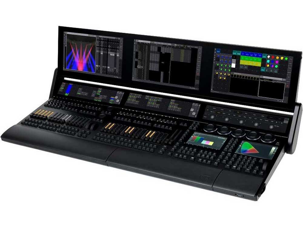 MA Lighting GrandMA3 Full Size lighting console with dust cover and desk lamps in flight case.
