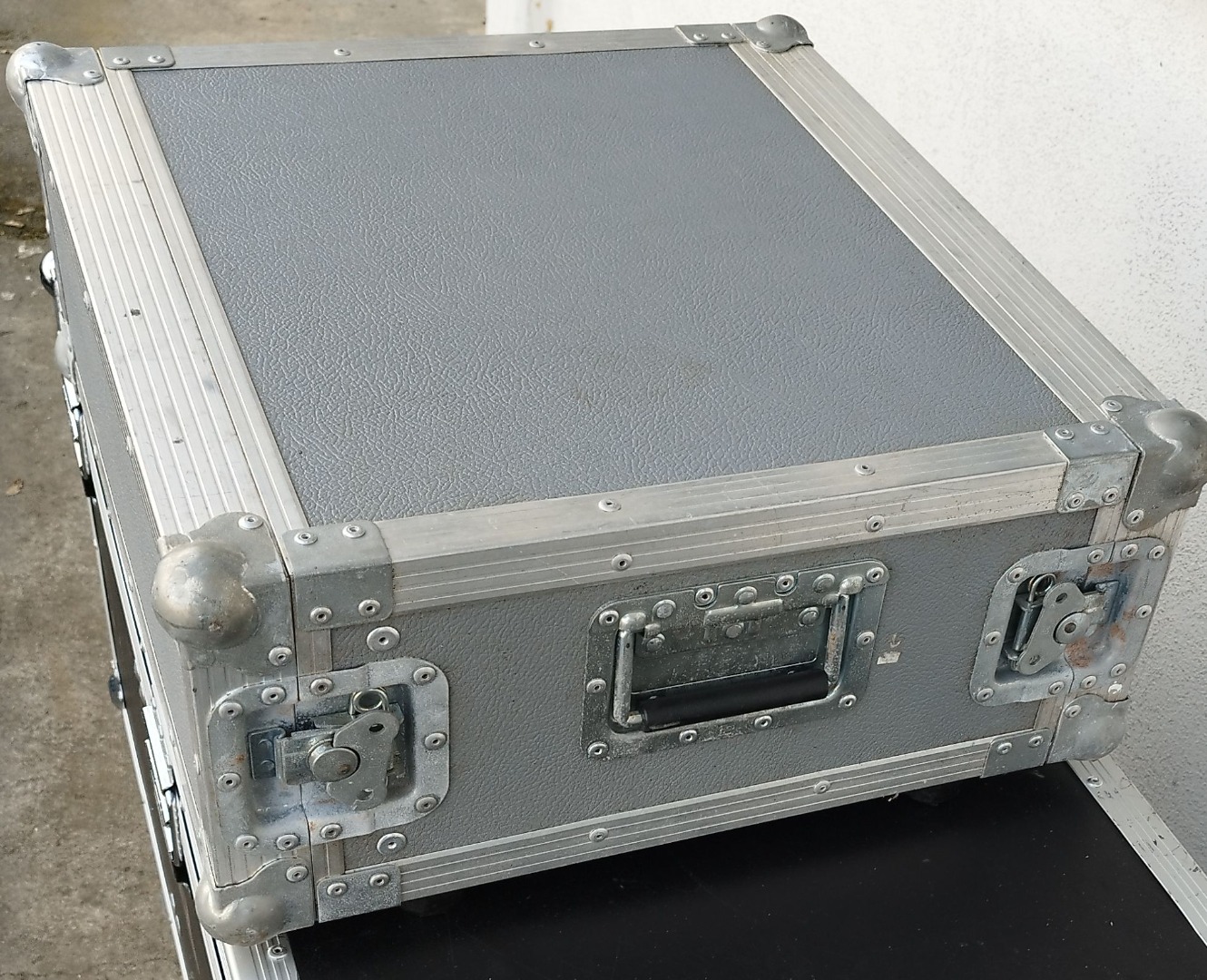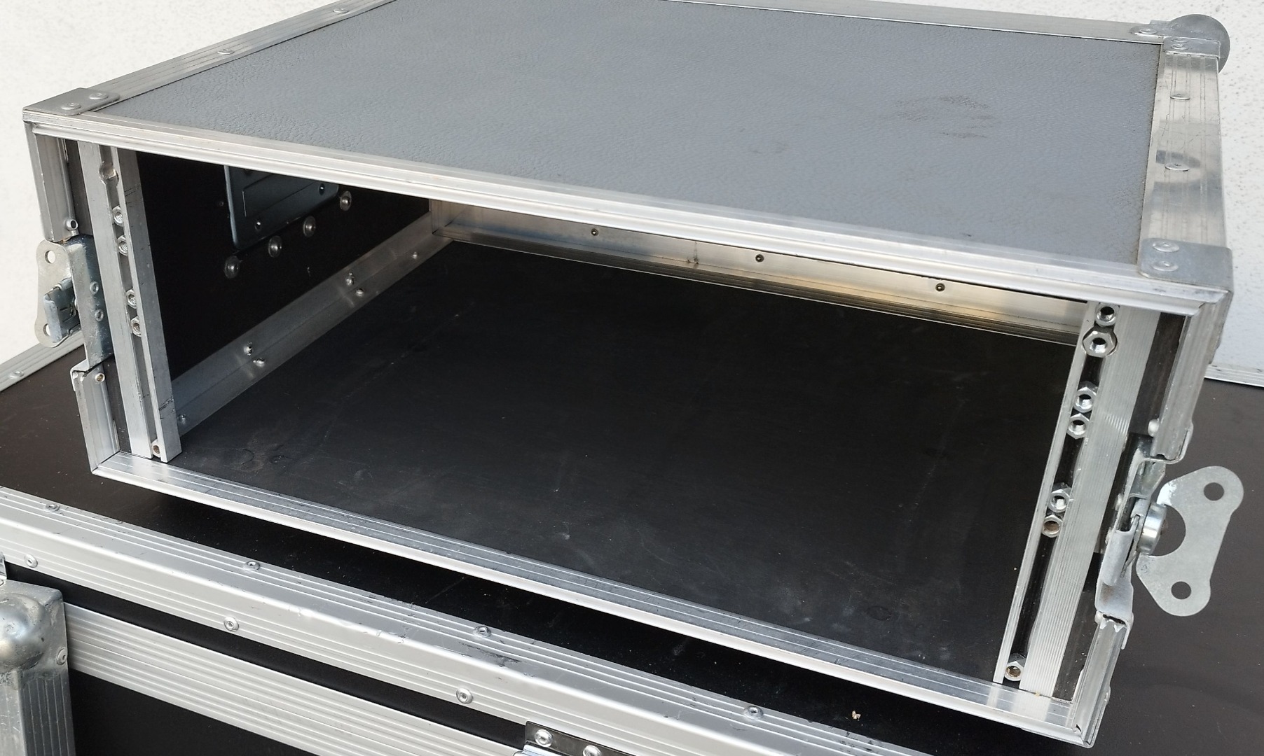 Gebrauchtes 19"-Rack in grau. Einbauhöhe ca. 19cm (4 HE), Einbautiefe 41,5cm zzgl. Deckel. Genaue Maße s. Fotos.