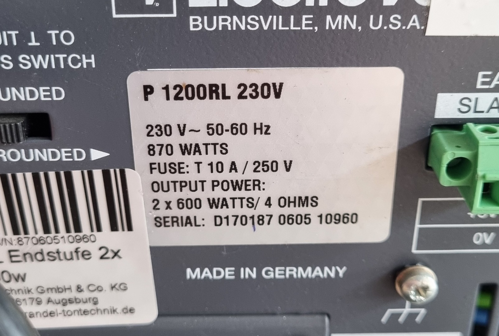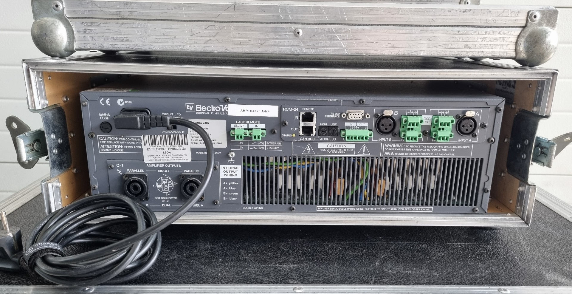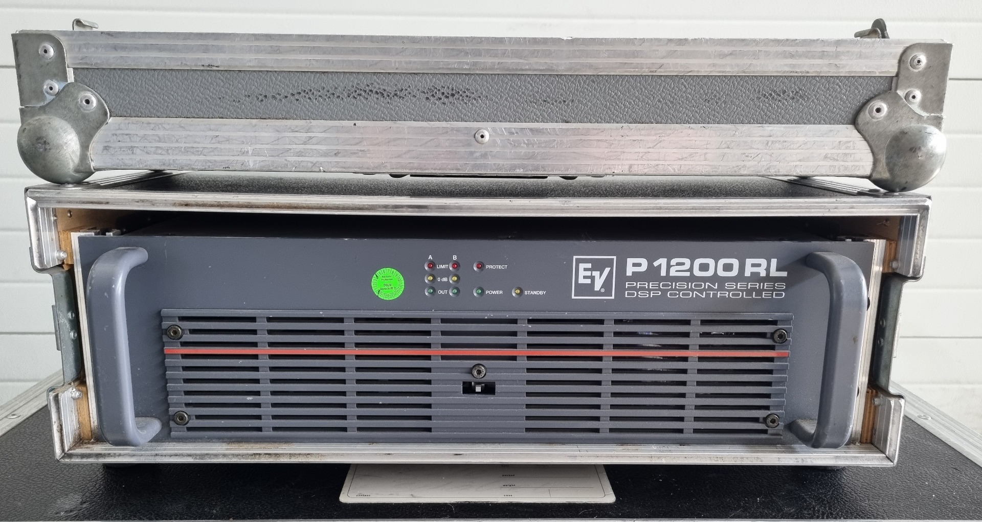 Zum Verkauf kommt hier eine EV P1200 RL Endstufe. Wie im ersten Bild erkennbar fehlt die Abdeckung des Hauptschalters. Die Endstufe kann aber trotzdem ohne Probleme ein- und ausgeschaltet werden. Das Case ist inklusive.