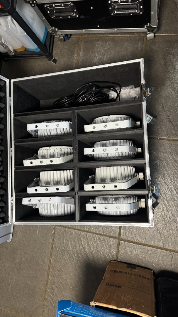 Im Bestand sind drei Sets mit 7 Scheinwerfern im Case inkl. je einem "Ersatzteilspender".