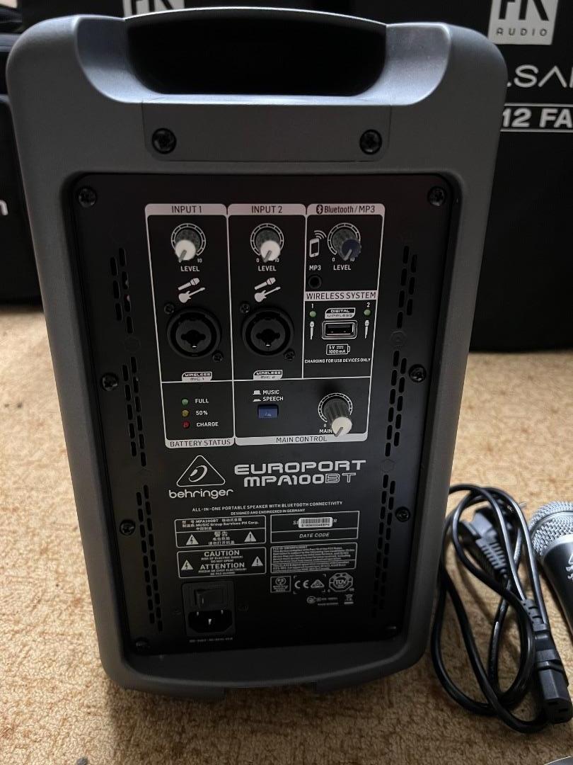 Das tragbare PA-System mit Wireless-Mikrofon MPA100BT von Behringer ist ein praktisches PA-Komplettsystem und eignet sich ideal für ein Publikum von bis zu 30 Personen sowie für den Einsatz auf Partys, in Schulen und bei Präsentationen. Dank Bluetooth-Konnektivität verbinden Sie mühelos Geräte mit dem Lautsprecher und streamen Musik über den 100-Watt-Lautsprecher. Der leistungsstarke 6"-Tieftöner und der hochauflösende Tweeter liefern hochwertigen Sound dank Class-D-Verstärkertechnik. Der MPA100BT kann per Netzteil oder mithilfe des integrierten Akkus betrieben werden, welcher mit einem Aufladevorgang bis zu 20 Stunden kontinuierliche Betriebszeit gewährt. Das PA-System verfügt über einen 4-Kanal-Mixer mit einfacher Pegeleinstellung und wird für ultimative Flexibilität mit einem drahtlosen Mikrofon geliefert.