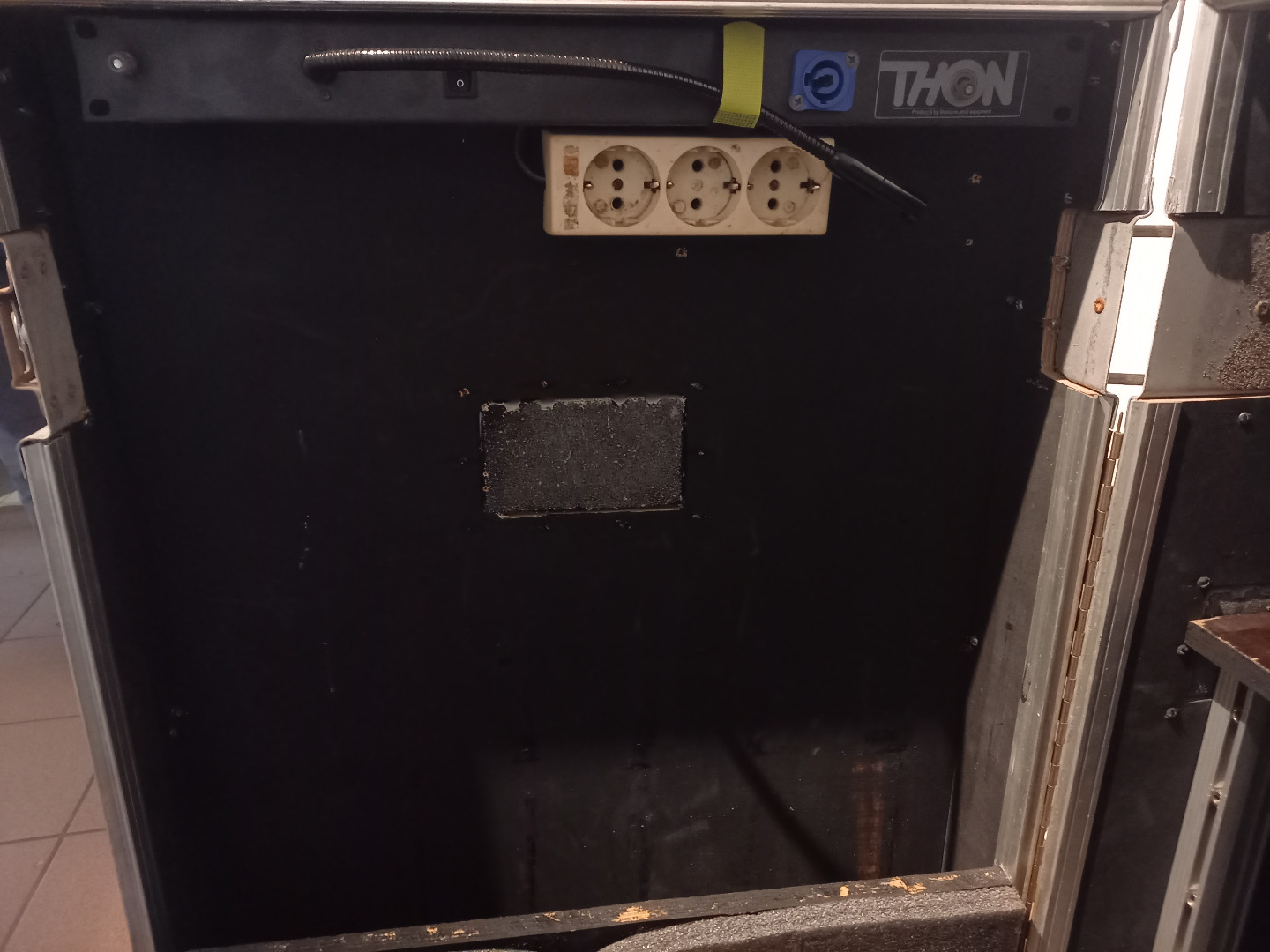 Rackschienen in der unteren Hälfte (10HE), Stromverteiler, Leuchte und Fach in der Tür