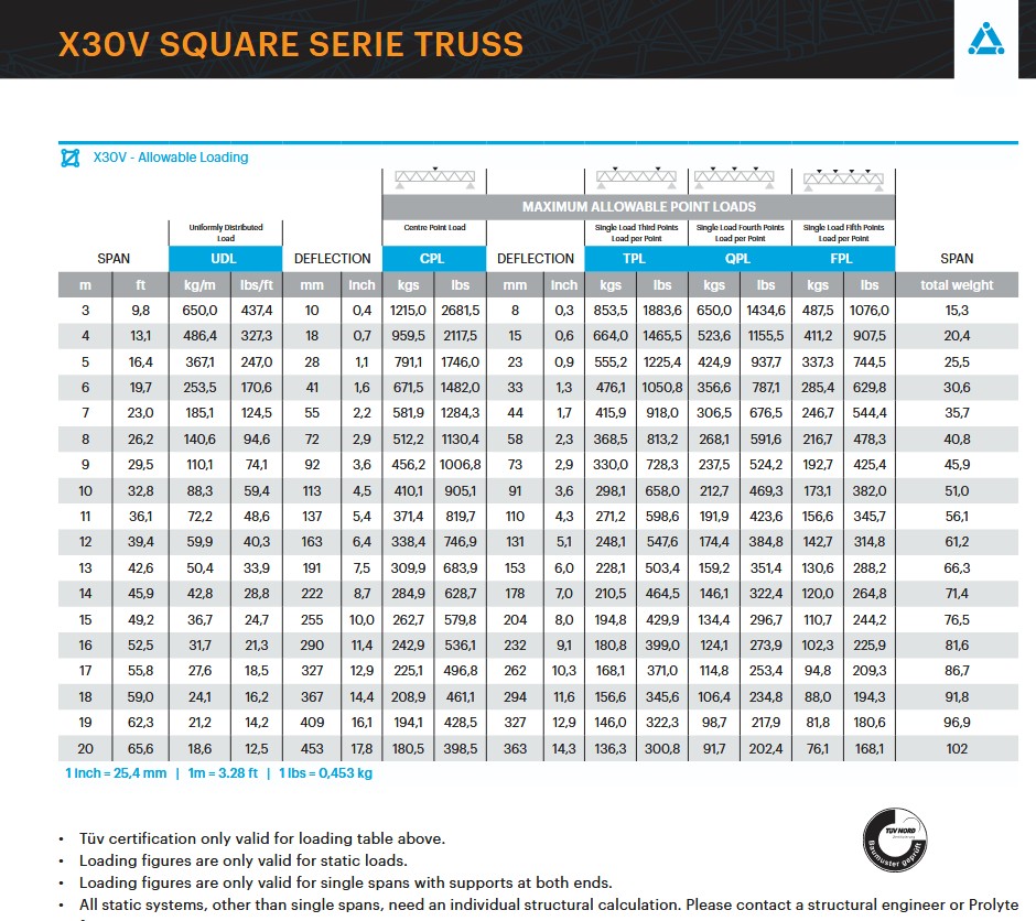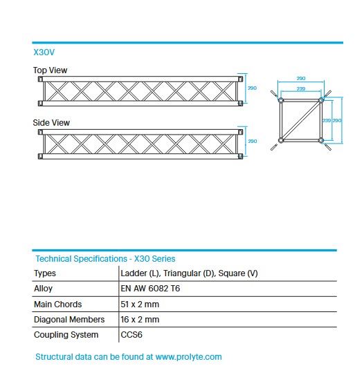 X30 truss is constructed of main chords (51 x 2 mm) and diagonal members (16 x 2 mm). Equipped with the CCS6 conical coupling system, the X30 truss is fast and easy to assemble. The X30 truss can be found in rental fleets all over the globe, where its low volume and flexible application possibilities makes it the ideal truss for exhibitions and low intensity rental jobs. X30 truss is available in ladder, triangular and square profiles and a range of corners and accessories.