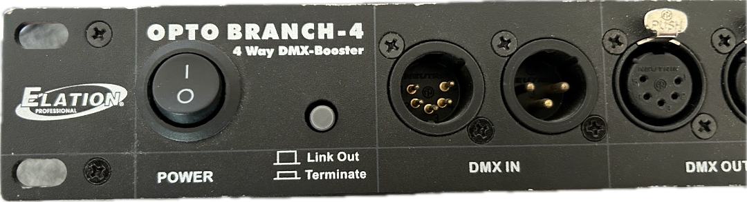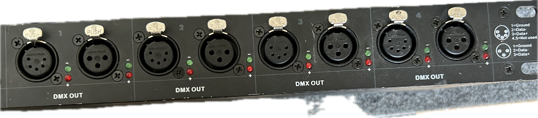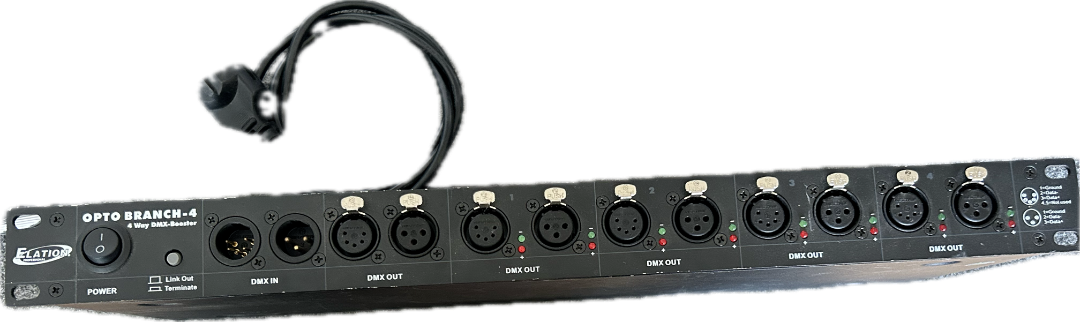 4 Wege DMX-Booster, 3 und 5 Pol, 1x DMX in, 1x DMX through, 4x DMX out