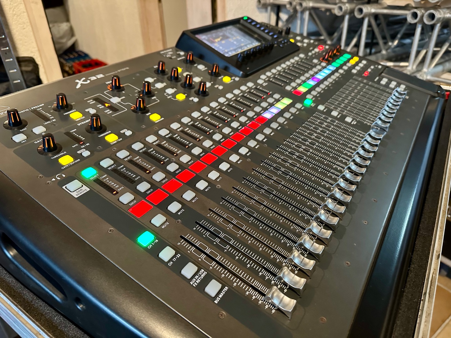 Wir verkaufen hier ein Behringer X32 in der Fullsize Version! Das Pult ist in einem guten Zustand, alle Fader und Potis funktionieren! Das Pult wurde ausschließlich von mir selbst benutzt, kein Dry-Hire oder Verleih! Dazu gibt es das Original Thon Case für den sicheren Transport! Das Pult wird verkauft, da ich auf ein kleineres Pult umsteigen!
