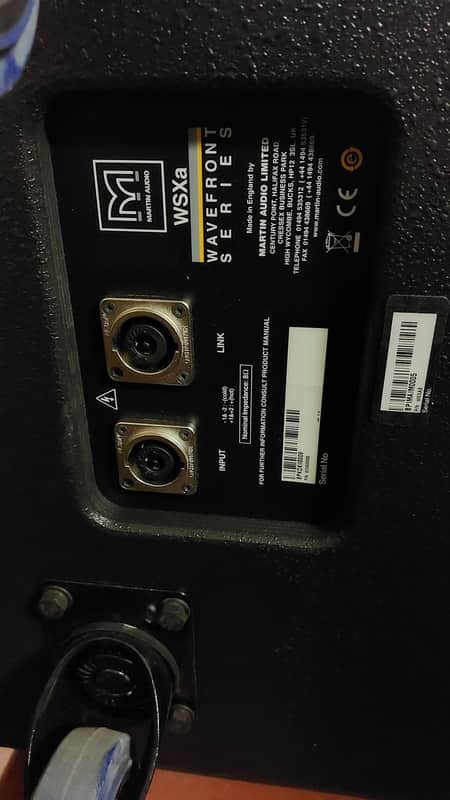 4.2 Specifications Freq response: LF limit: Rated Power: Sensitivity: Maximum SPL: Impedance: Crossover Freq: 38-150Hz +/- 3dB (half space)-10dB @ 28Hz 600W into 8 ohms, 2400W peak 105dB (half space with band limited pink noise) 132dB continuous, 138dB peak (half space with band limited pink noise) 8 ohms nominal 150Hz or below Crossover System: Martin Audio DX1 Loudspeaker Management System, MX4 or MX5. (See operating instructions) Connectors: Dimensions: Weight: 2 x Neutrik NL8 (W) 572mm x (H) 1066mm x (D incl wheels) 1065mm (W) 22.5ins x (H) 41.9ins x (D incl wheels) 41.9ins 96kg (211 lbs)