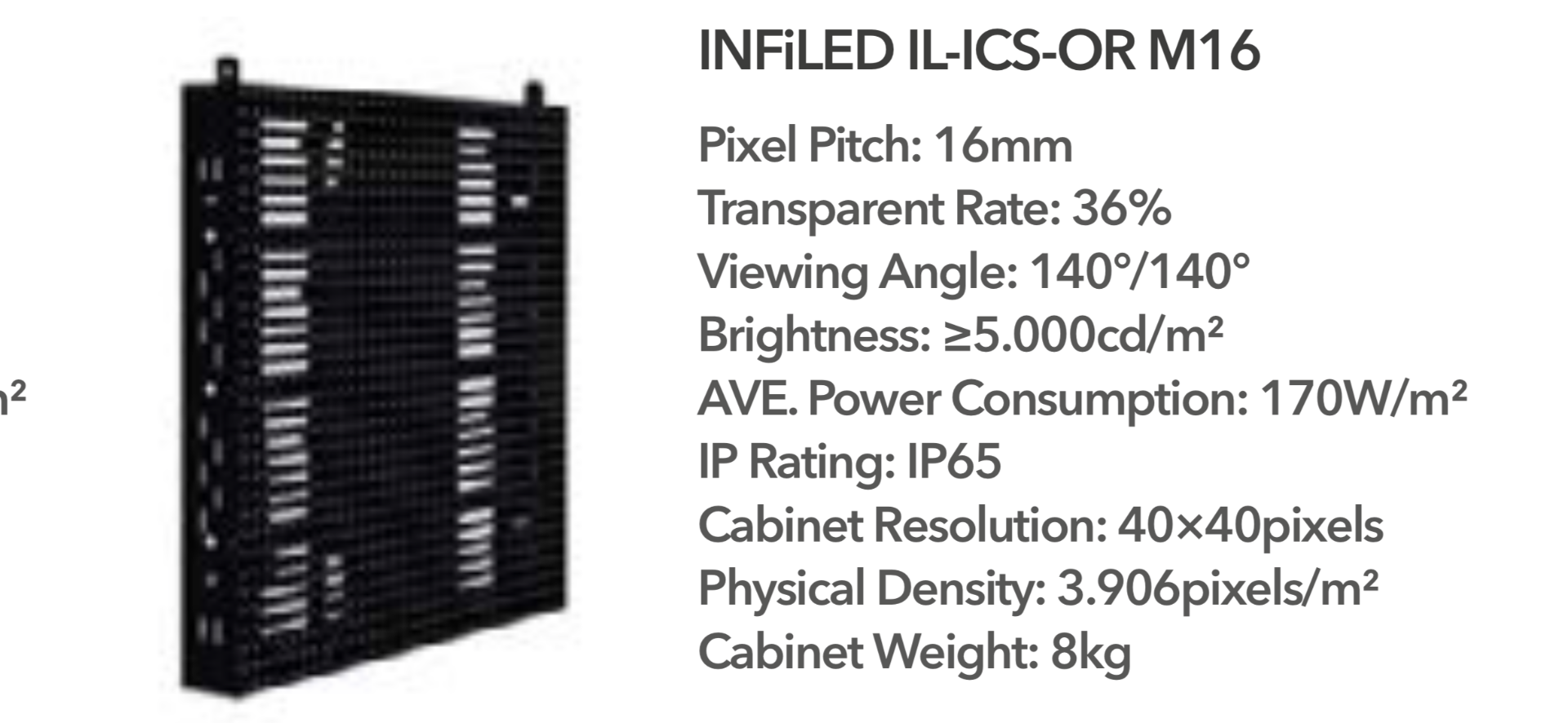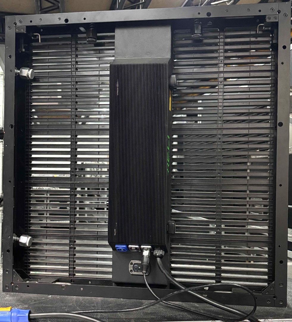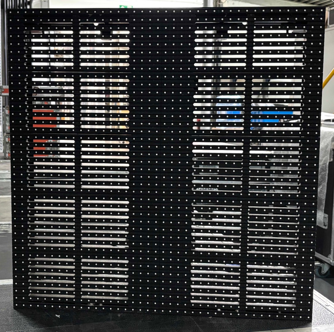 122 LED Videopanel 640 x 640 mm ( hier also inkl. 2 Ersatzframes ), IP 65, 16mm Pixelpitch, 40*40 pix, 38% transparent, Software LINSN, Gewicht 8 kg/Stk., über 5.000 nit, hell genug um bei direktem Sonnenlicht ein perfektes Bild zu liefern, aber auch bestes Bild bei nur noch 5% Helligkeit. Sehr robustes System. Keine größeren Schäden.