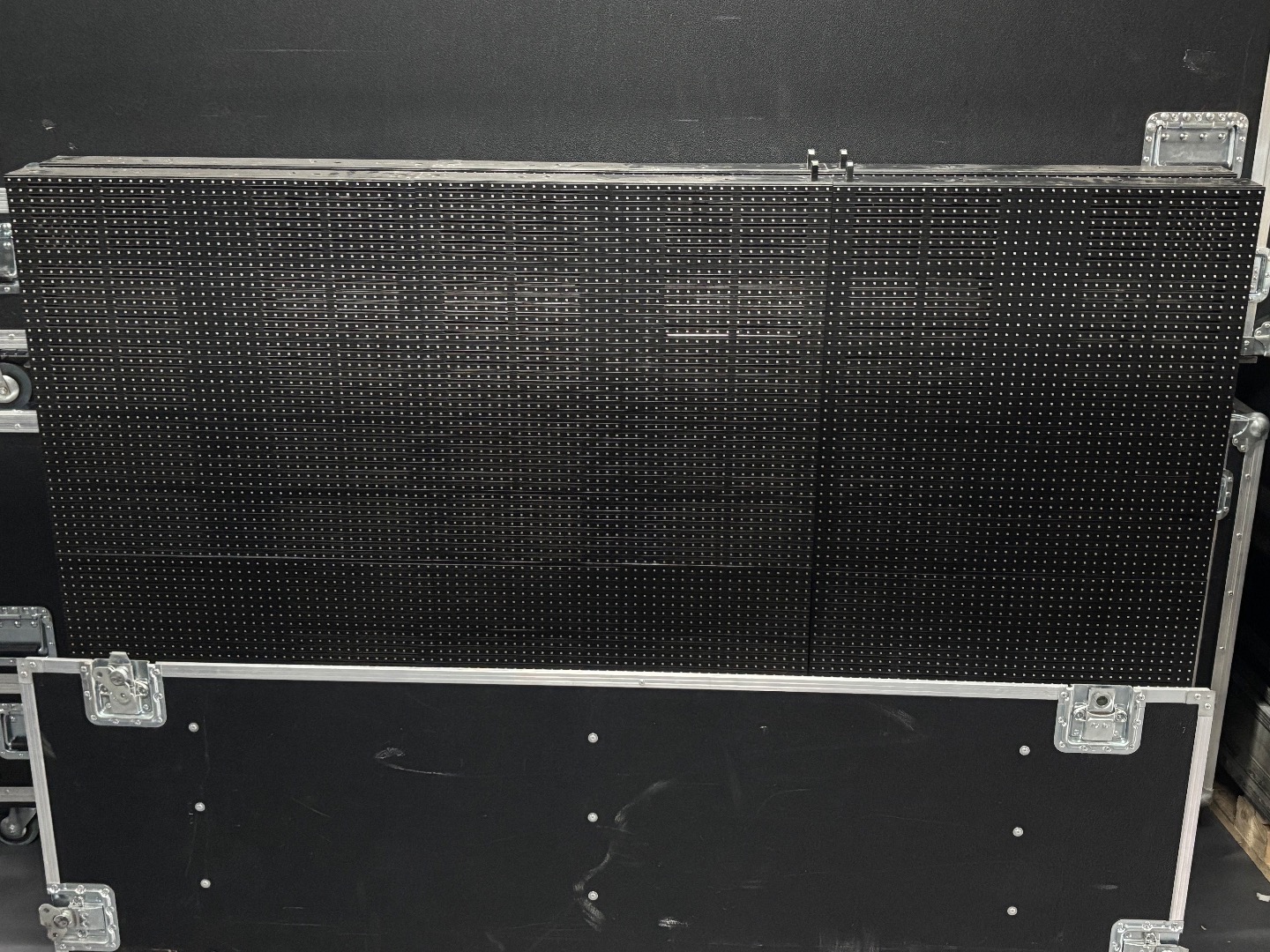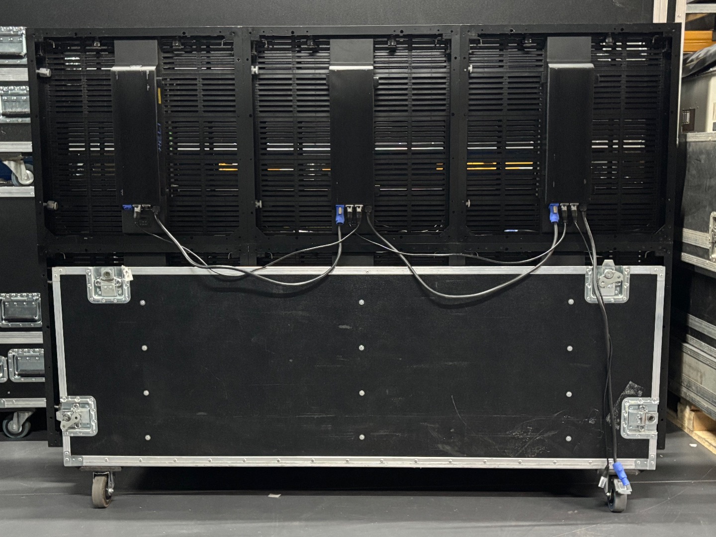Im Preis enthalten sind 3 Cases für je 24 Frames, sowie 3 Cases für je 16 Frames, 6 Stück 1,28m Riggingbars, 2 Stück 0,64m Riggingbars, alle Daten und Stromverbinderkabel, insgesamt mehr als benötigt, alle Stromanschlusskabel, ebenfalls mehr als benötigt, dazu 1 Controller, dazu genügend CAT Zuleitungen für gleichzeitigem Aufbau von 3 unabhängigen Flächen.