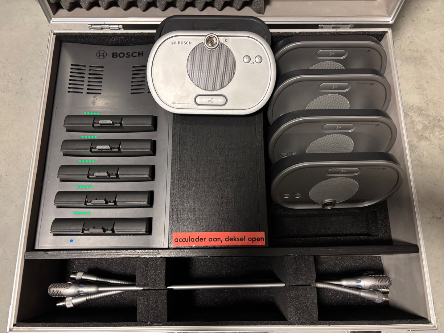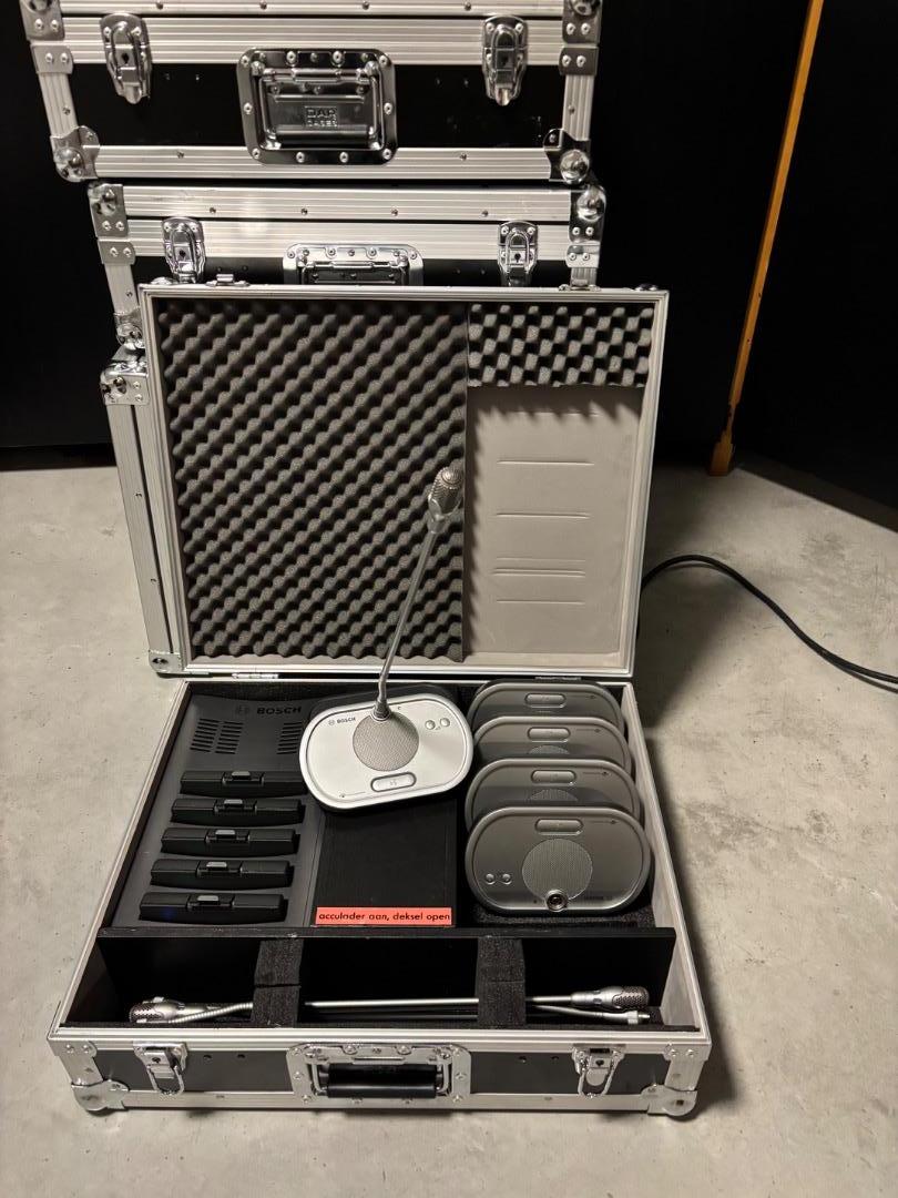 6x flightcase with each 5x Bosch DCN-WD-D wireless delegate unit + long mic+ battery+ 5 bay charger, price €500 each