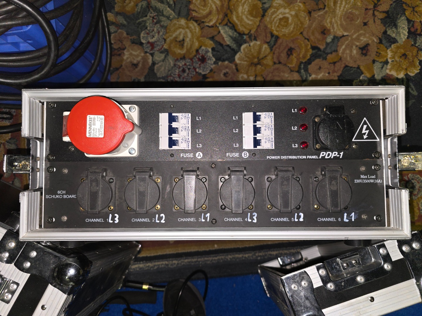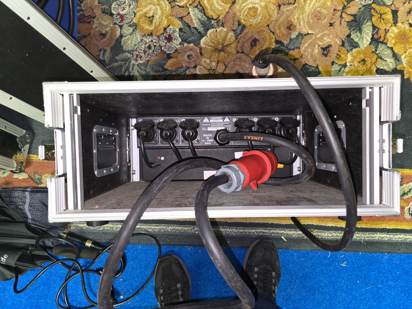 32 A Stromverteilung mit einem SCHUKO und einem 32 A CEE Ausgang auf der Front und sechs SCHUKO Ausgängen auf der Rückseite.