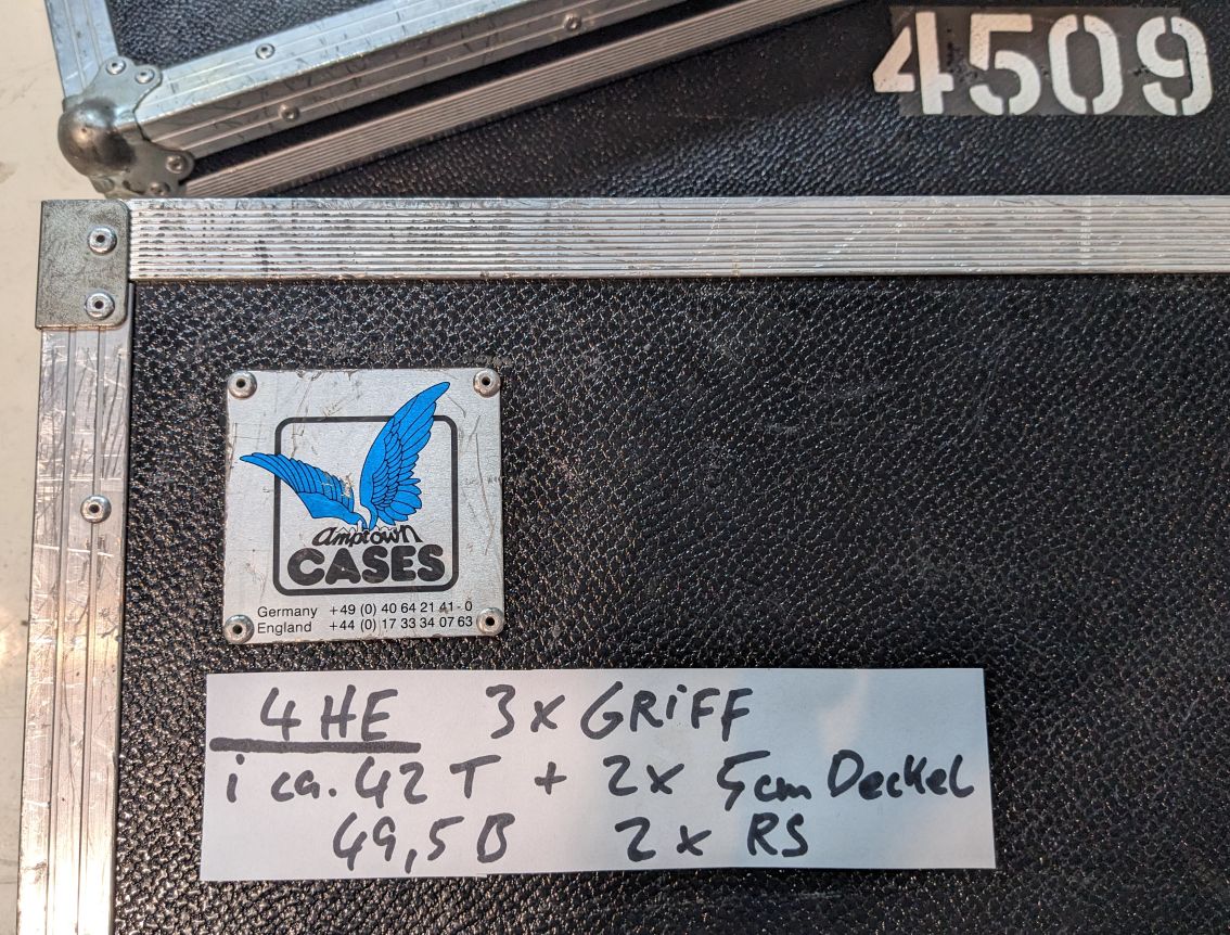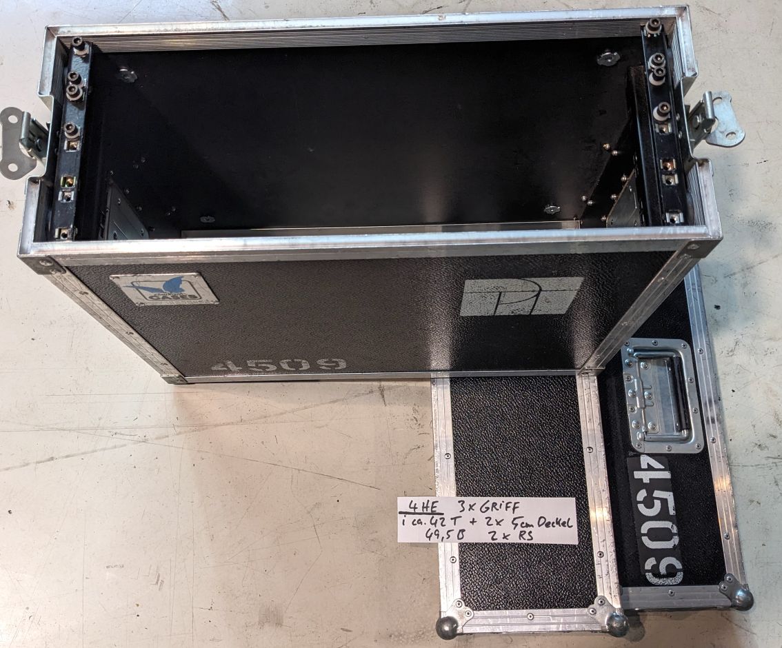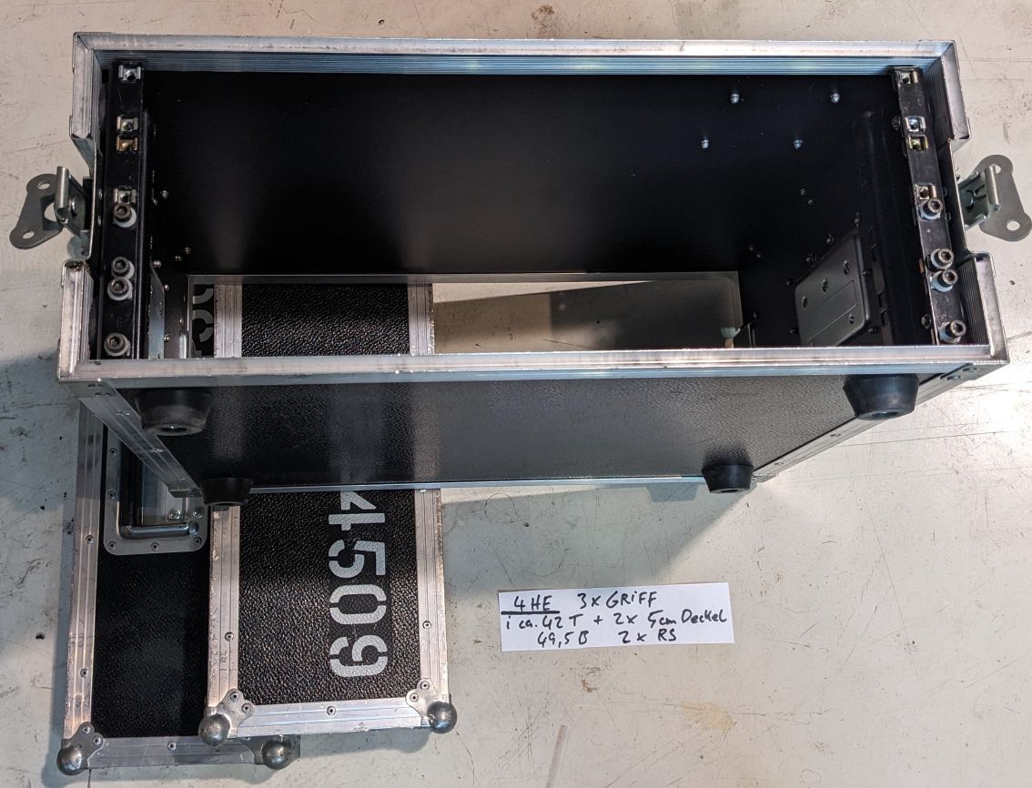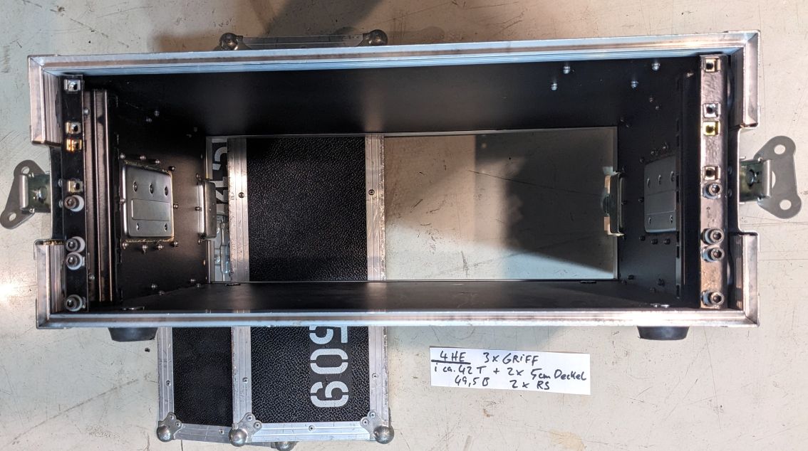 Flightcase Handkoffer 4HE, 19". Passend bis 500mm Gerätetiefe (bis innenseite Deckel hinten).