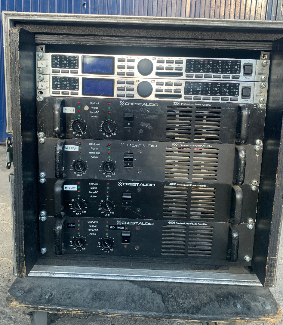 1x Rack de amplificación ( 2 x etapas Crest Audio 6001, 1 x etapa Crest Audio 4801, 1 x etapa Crest Audio 3301, 2 x Procesadores)