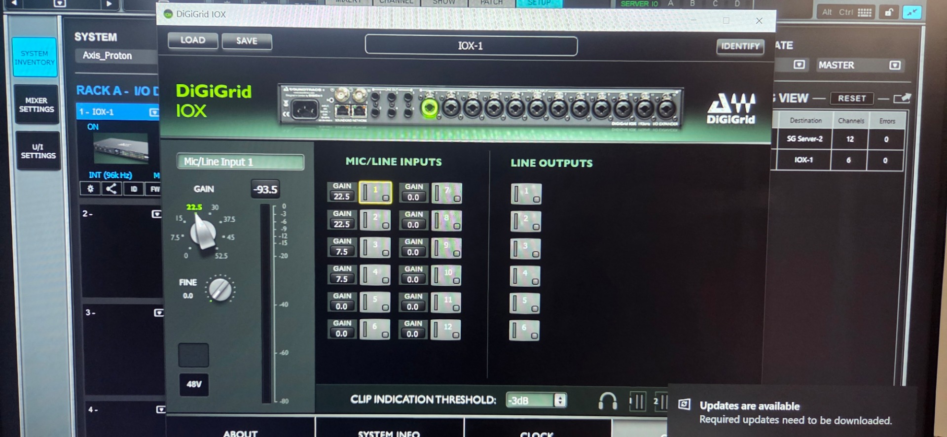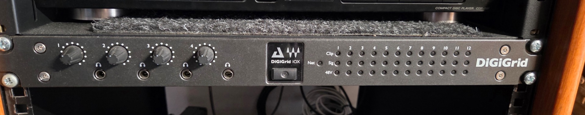 With 3x DigiGrid IOX interfaces > The DiGiGrid IOX advanced audio interface delivers high-resolution monitoring in the studio and control room alike, with 12 mic/line inputs that feature broadcast/studio-quality preamps, 6 line outputs, and 4 powerful headphone outputs to provide independent mixes for each musician. Connect the IOX to a SoundGrid server, and run up to hundreds of SoundGrid-compatible plugins with ultra-low, 0.8 millisecond latency—all integrated in your DAW of choice.