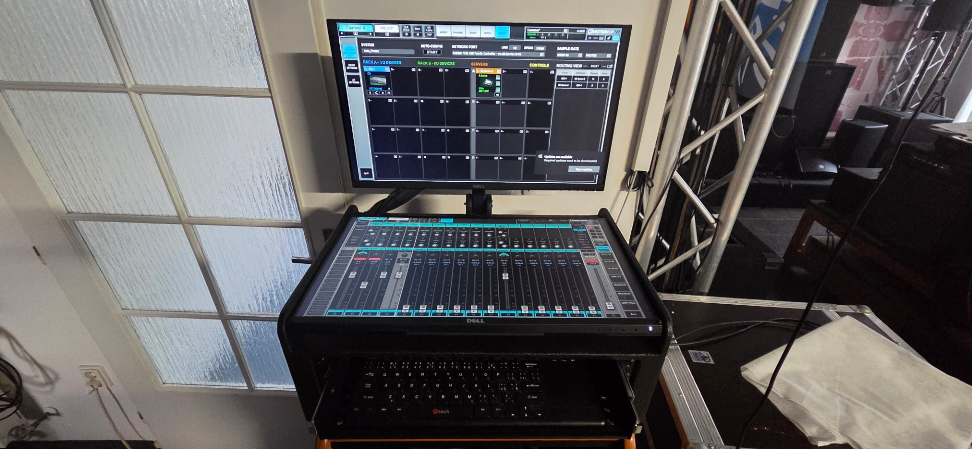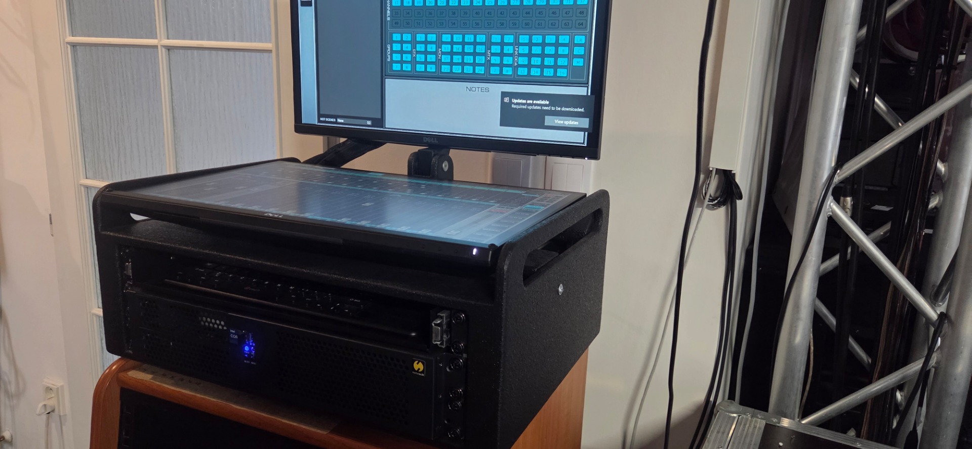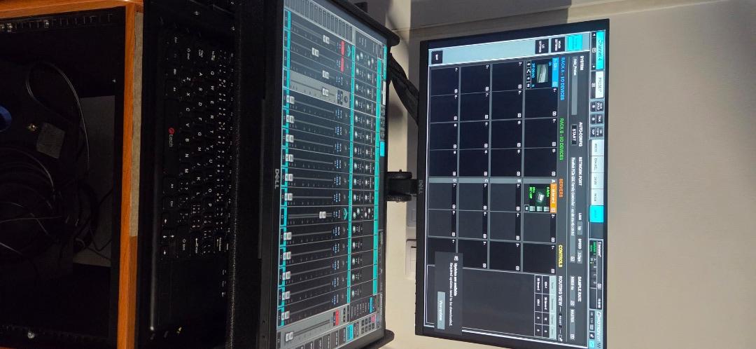 Clone of Waves LV1 32channels, with two large 24" screens with touch controls, server and client PC integrated in custom enclosure with monitor holder and shelf for keyboard with touchpad, internal SoundGrid switch with ethercon connectors at the back, powercon single powercon for mains power.