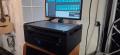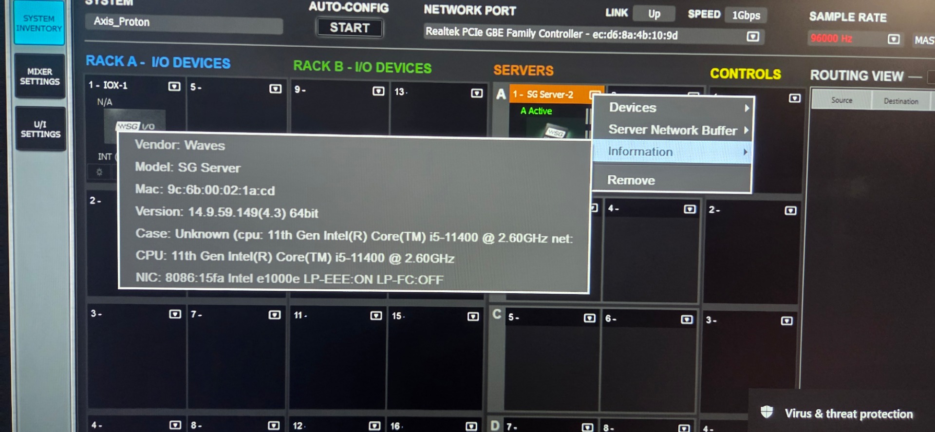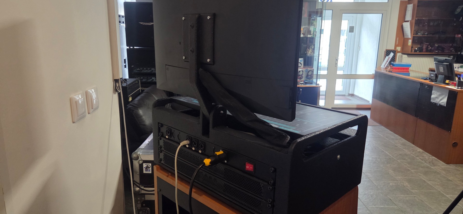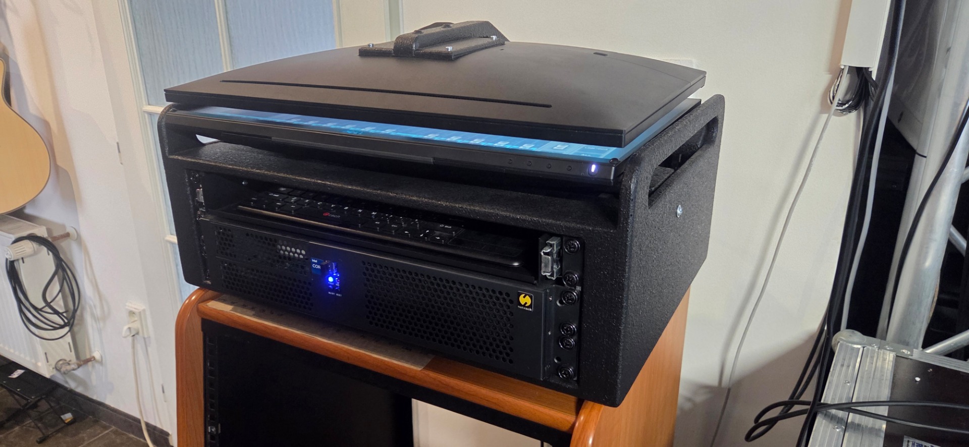 Clone of Waves LV1 32channels, with two large 24" screens with touch controls, server and client PC integrated in custom enclosure with monitor holder and shelf for keyboard with touchpad, internal SoundGrid switch with ethercon connectors at the back, powercon single powercon for mains power.
