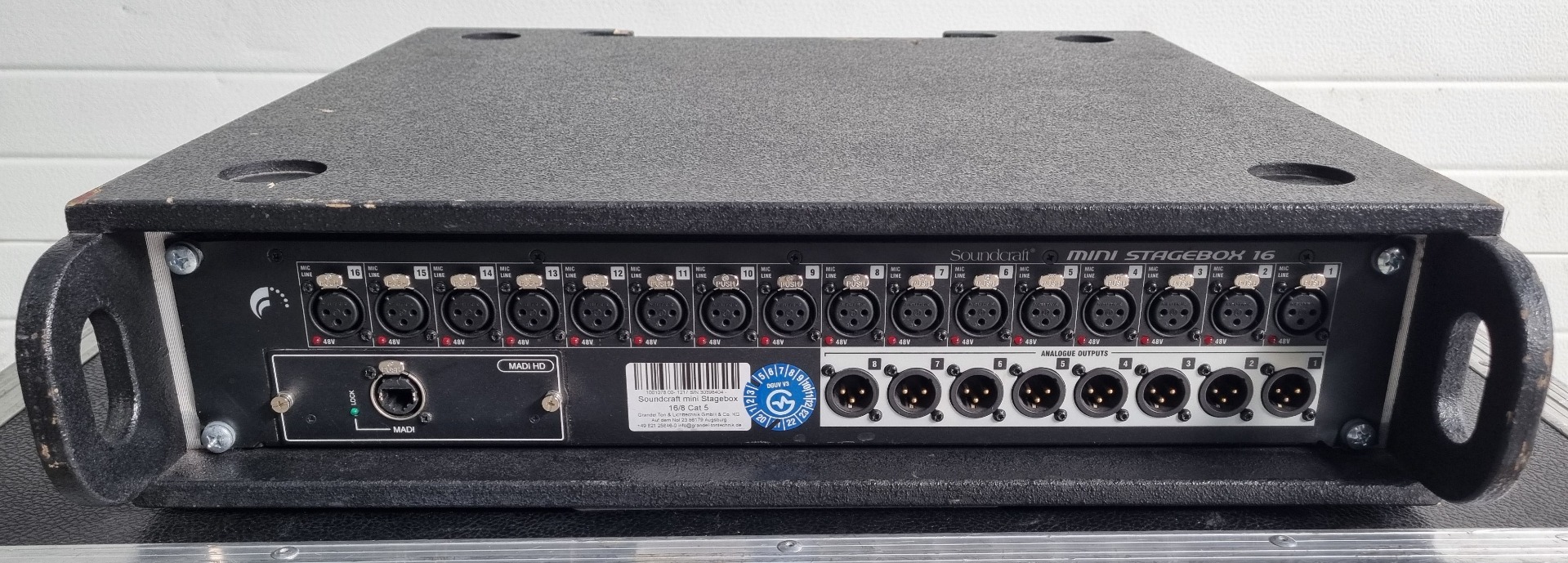 Zum Verkauf kommt hier eine Soundcraft Mini Stagebox 16 mit Madi HD Karte.