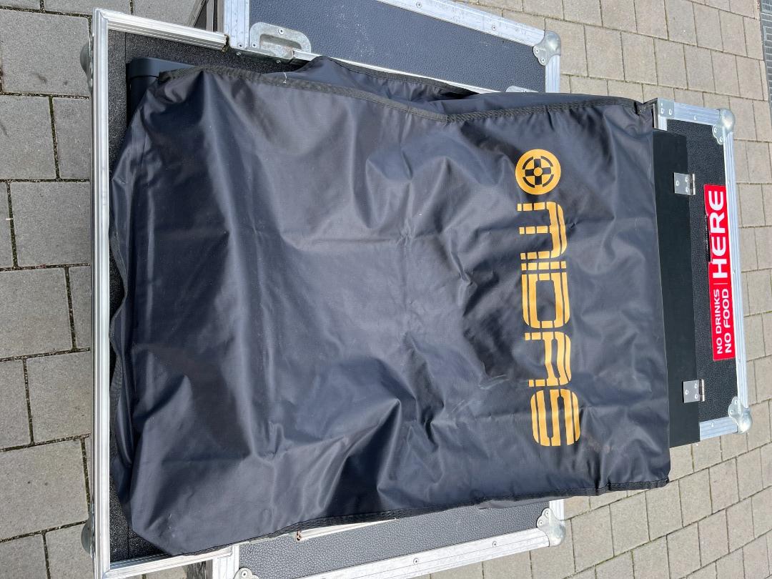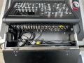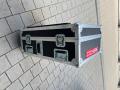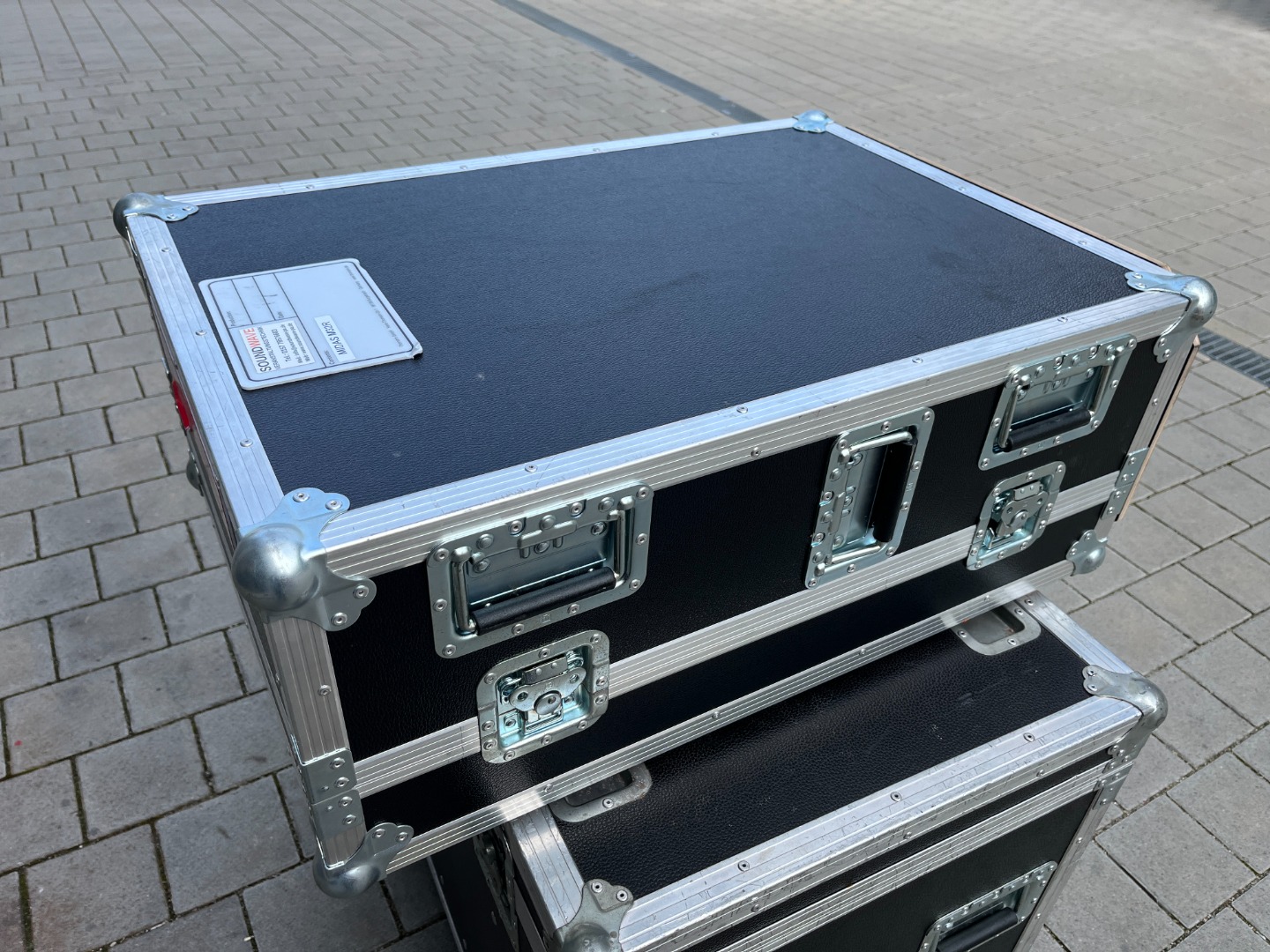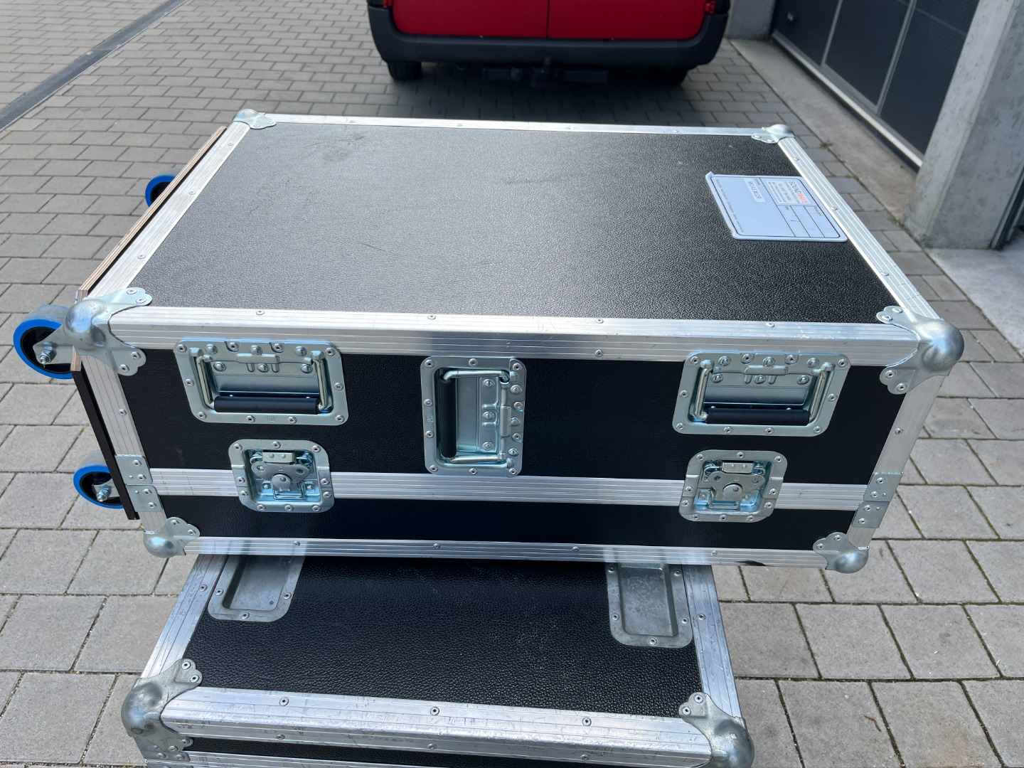 Stabiles Case mit 6 Griffen, Rollen, sodass die Haube hinter dem Pult stehen kann, ordentlich gepolstert, mit Dog-House für Steckdosenleiste und Router etc.