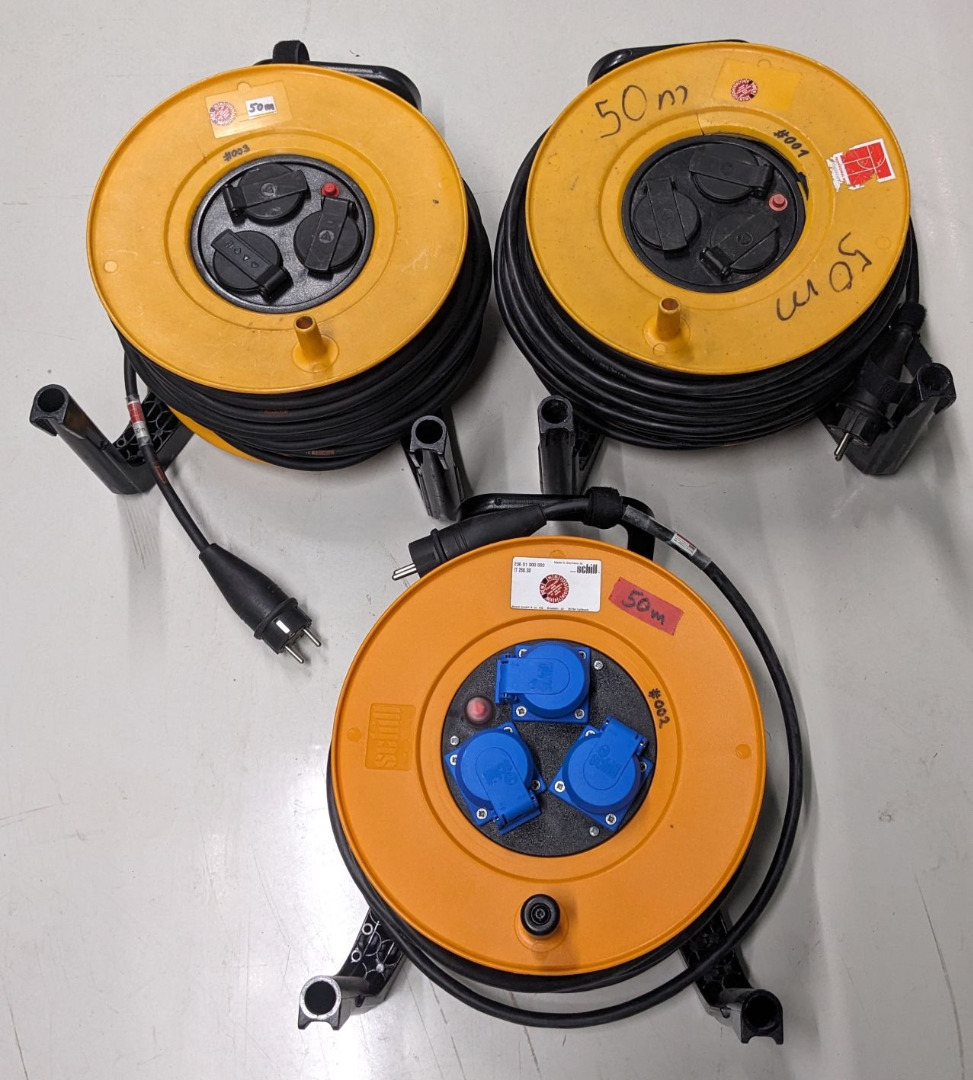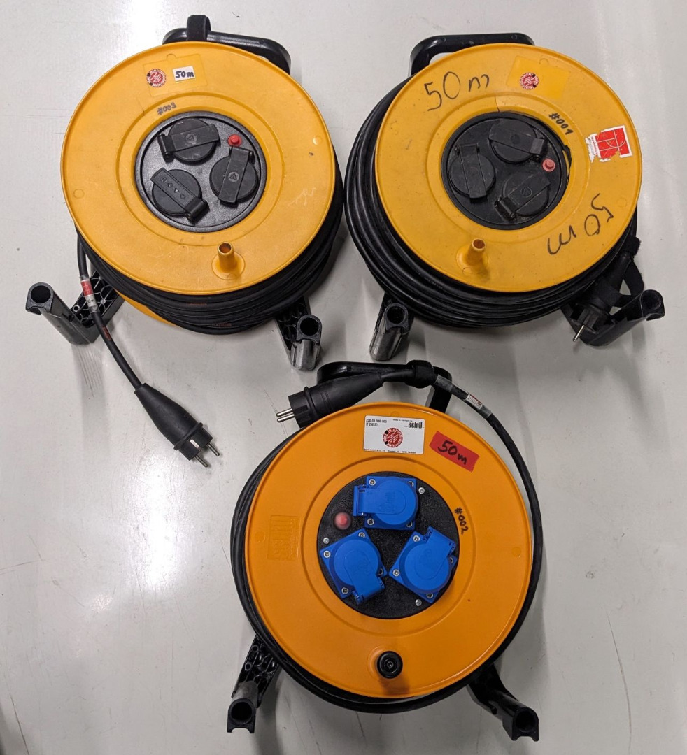 50m Schuko Kabeltrommel aus Gebrauchtwarenbestand, ohne aktuelle DGUV-V3 Prüfung.