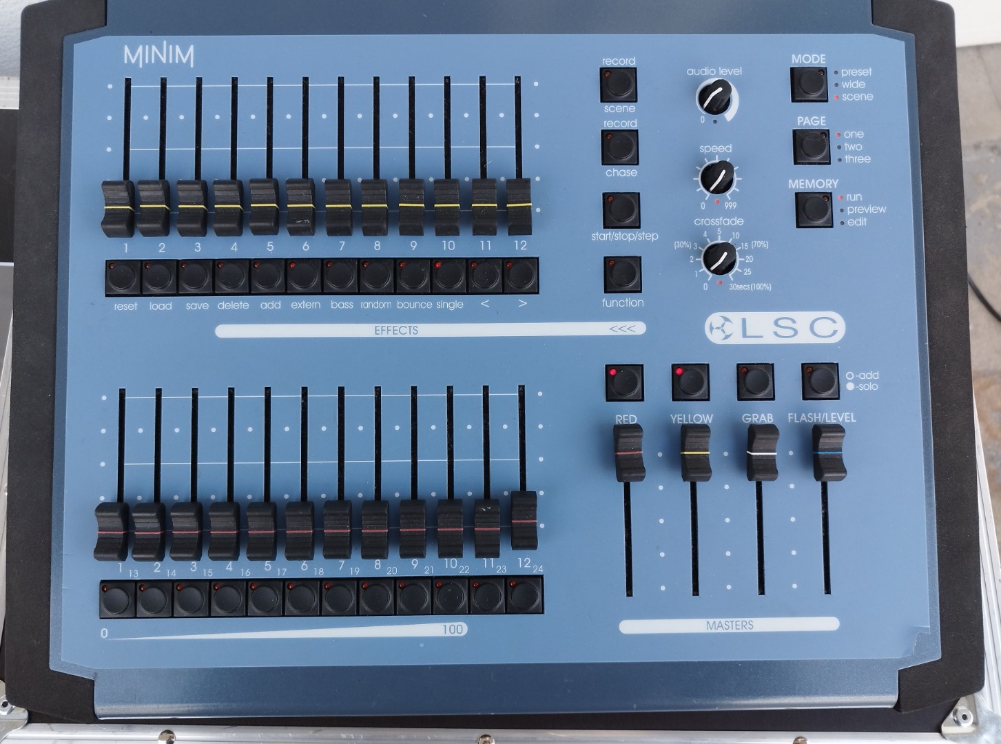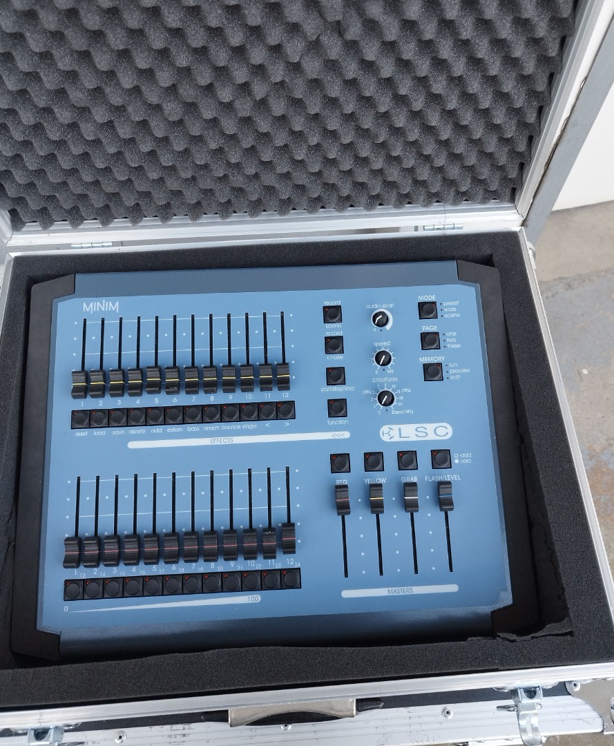 Gebrauchtes, gut erhaltenes Lichtsteuerpult Minim 12 von LSC. Zur Steuerung von 12/24 DMX-Kanälen, inklusive Flashtasten, 36 Szenenspeicher, Fadezeiten, Chase etc. Komplett mit deutscher Anleitung und Anschlusskabel im Case/Transportkoffer.