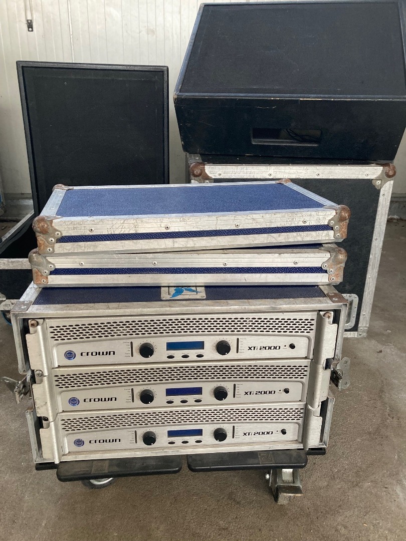Inklusive drei Endstufen Crown XTI 2000, auch im Case. Bei der unteren Endstufe läuft leider nur ein Kanal.