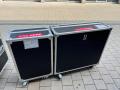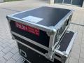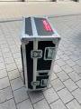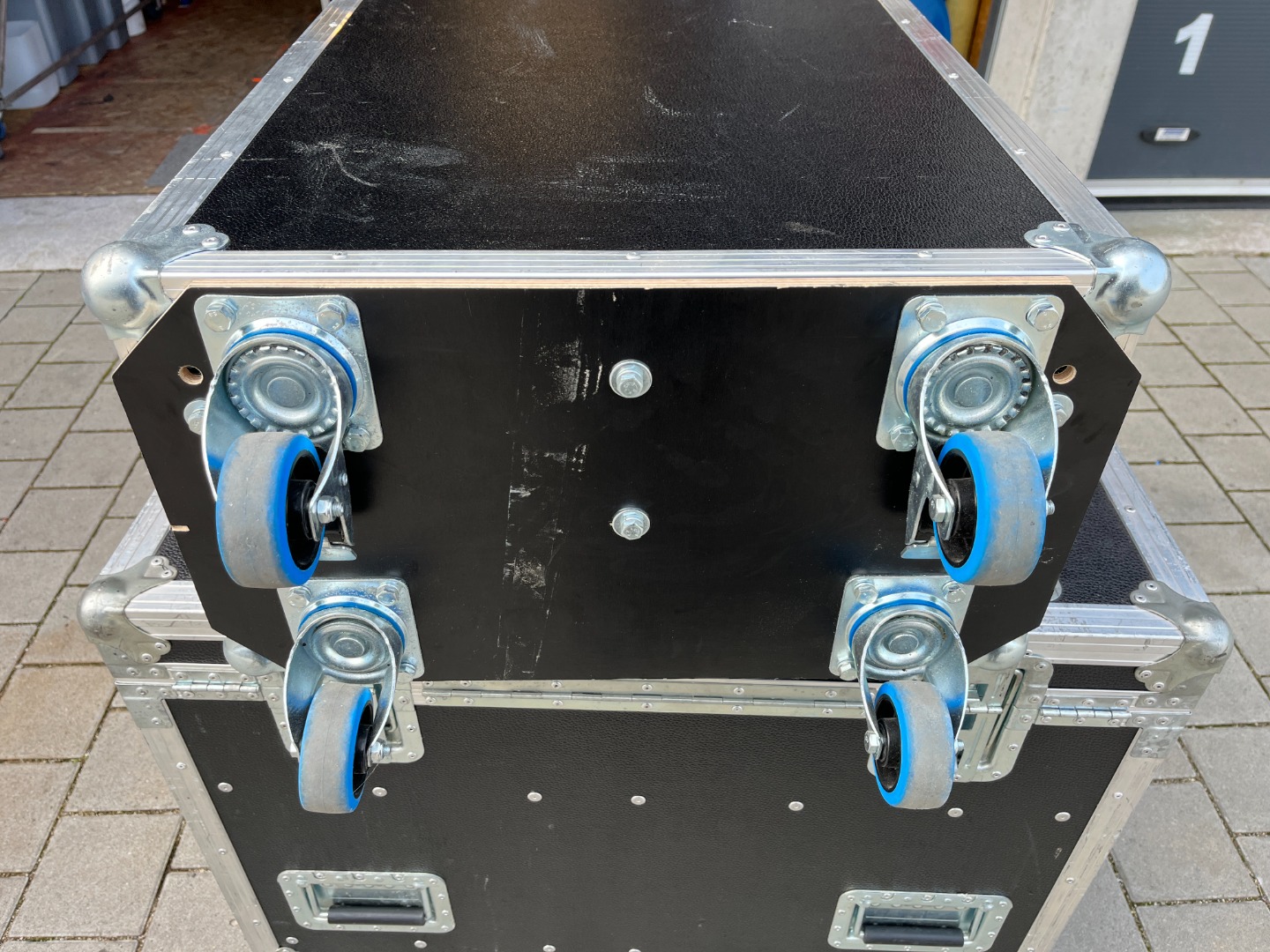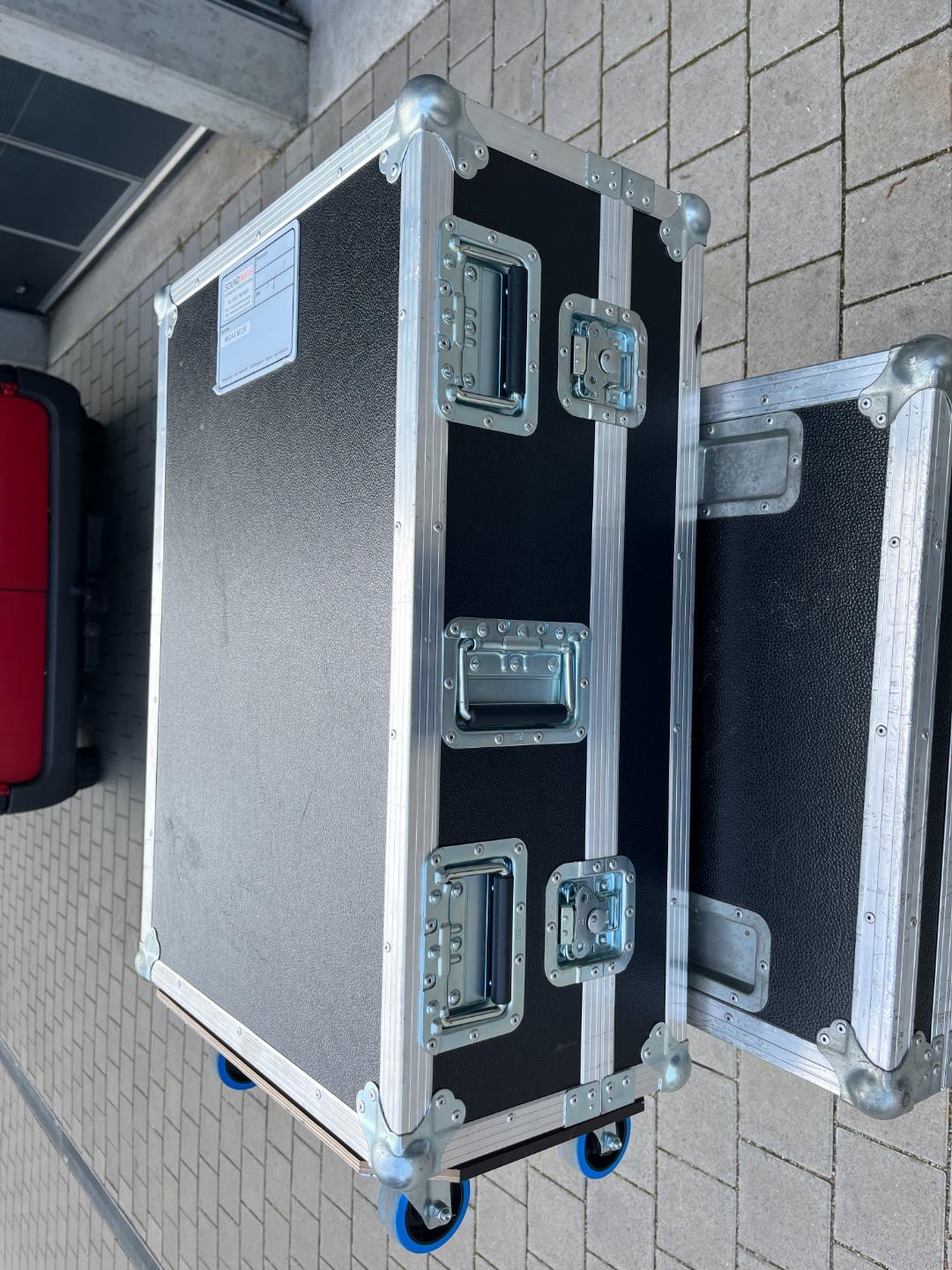 Stabiles Case mit 6 Griffen, Rollen, sodass die Haube hinter dem Pult stehen kann, ordentlich gepolstert, mit Dog-House für Steckdosenleiste und Router etc.