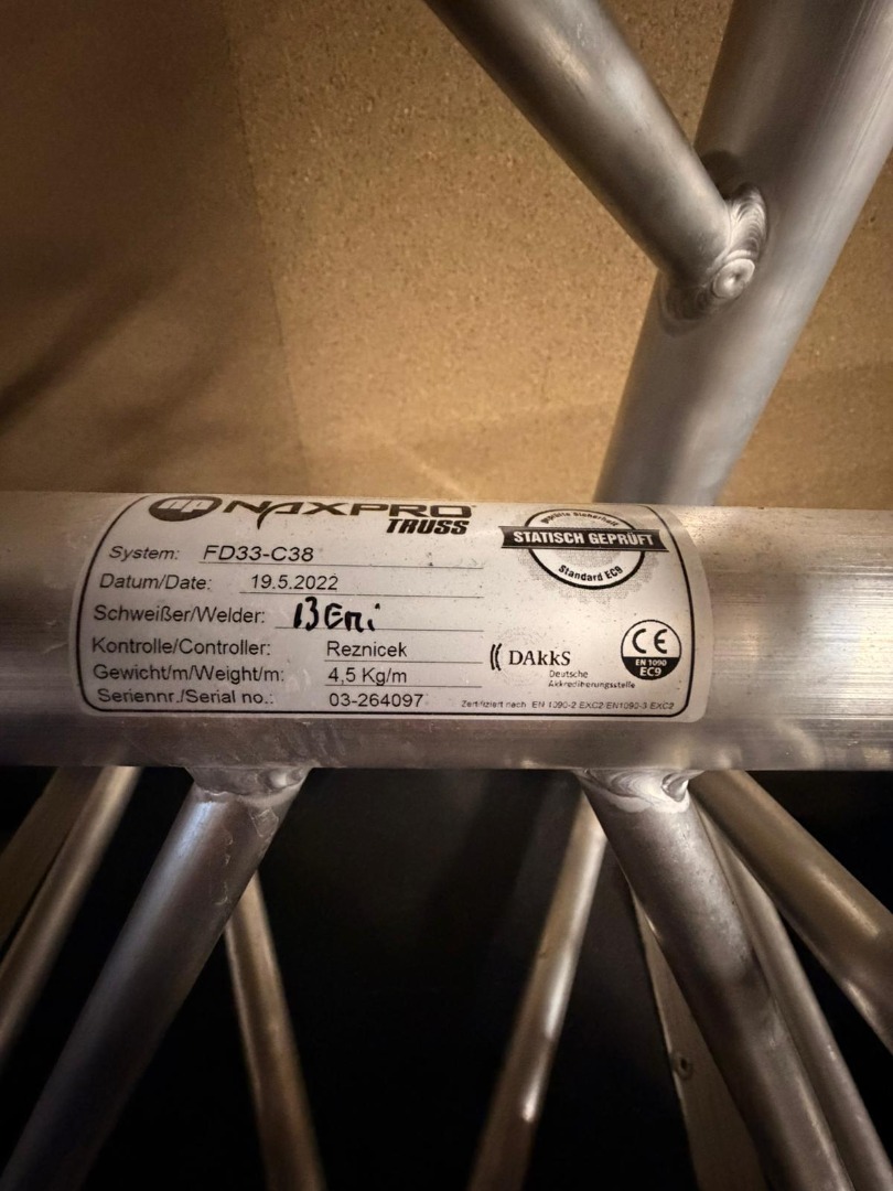 Ich verkaufe Naxpro Truss FD33-C38 Traversen. Die Elemente sind neuwertig und wurden einmal benutzt.