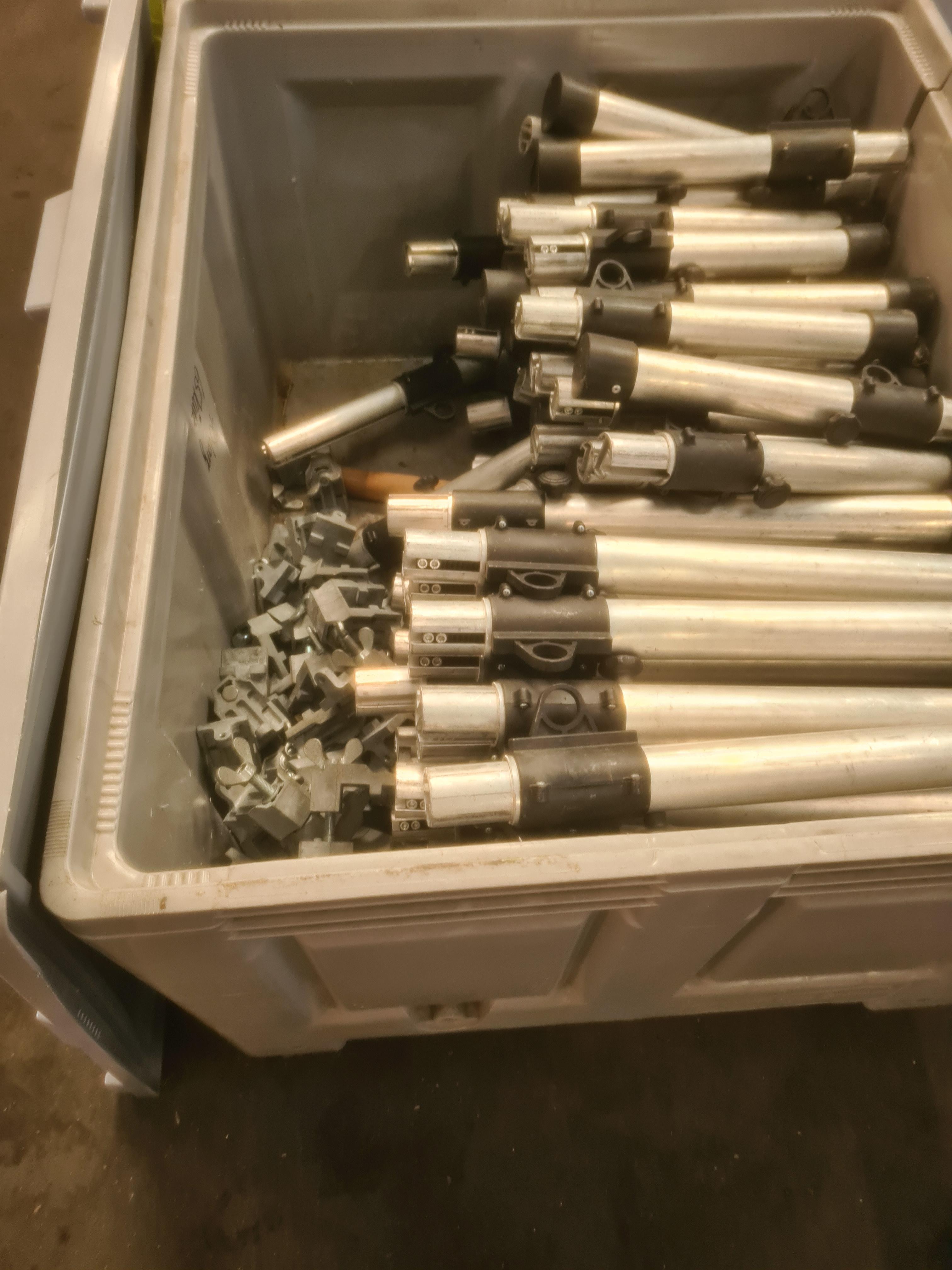 17 stk 2 mal 1 meter Outdoor podest. 40 stkTeleskopbeine 60 bis 96 und 65 stk 40 bis 76 cm höhe. Inkl Rollcontainer und Gussklammern. Absolutes spitzenprodukt. Gebraucht ungeprüft und ohne Garantie aber in Gebrauchsfähigem Zustand.