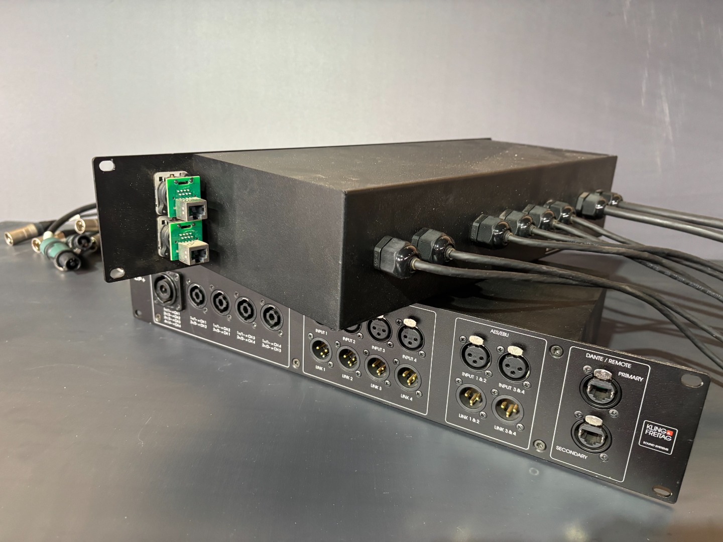 Zusätzlich hat es je zwei AES/EBU-Input-Anschlüsse (1/2 und 3/4) und zwei AES/EBU-LinkAnschlüsse (1/2 und 3/4). Für DANTE-Übertragungen stehen dem Anwender je ein primärer