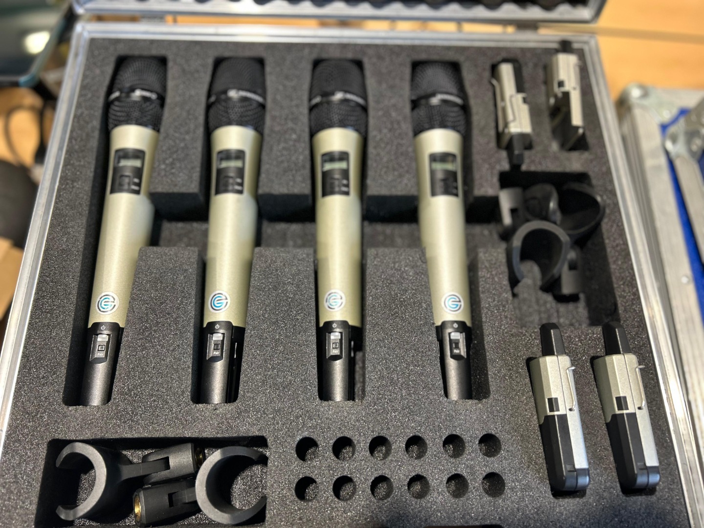 Der Preis versteht sich für einen Handsender mit Akku und Klammer ohne Zubehör. Top Zustand. Es sind insgesamt 12 vorhanden. Weiteres Zubehör (Headsets, Handsender, Taschensender Empfänger, Tischsprechstellen auf Anfrage.