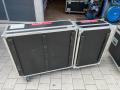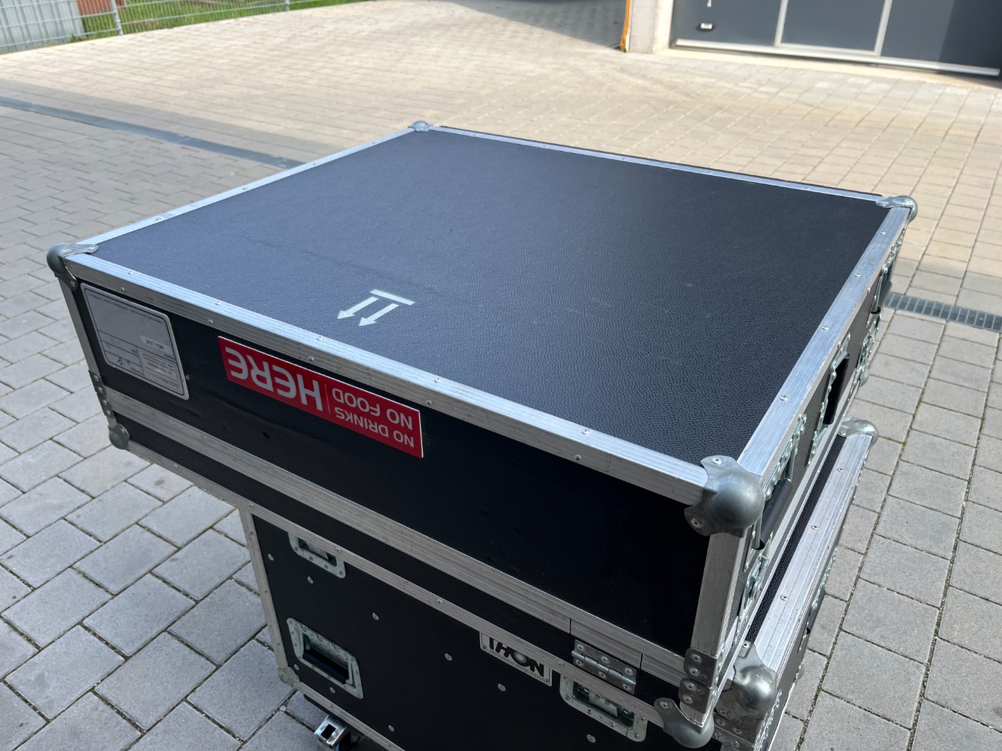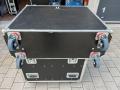 Stabiles Case mit 6 Griffen, Rollen, sodass die Haube hinter dem Pult stehen kann, ordentlich gepolstert, mit Dog-House für Steckdosenleiste und Router etc.
