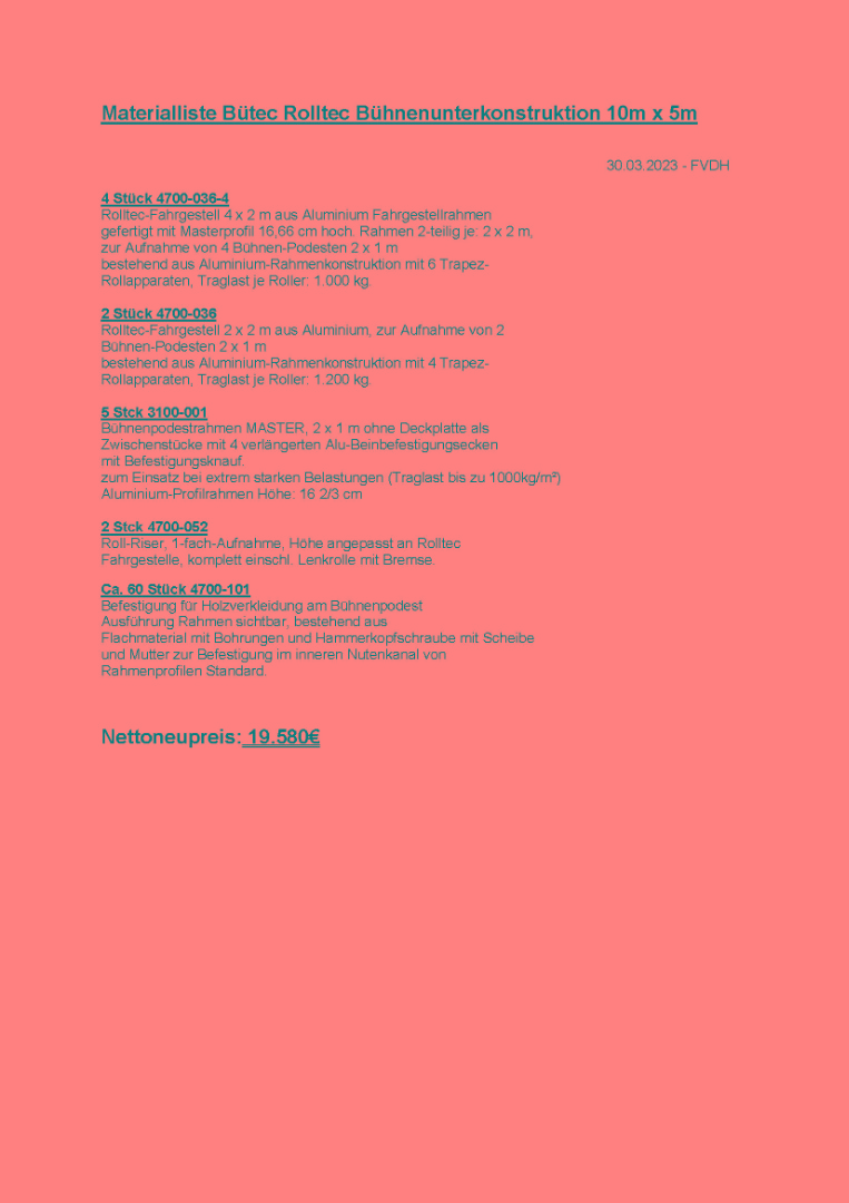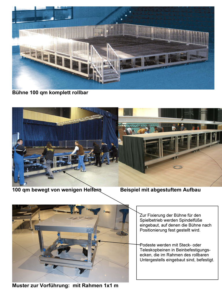 Die Unterkonstruktion wurde bei und als 10 x 5m (BxT) Bühne eingesetzt. Sie ist, trotz ihrer Größe, sehr leicht rollbar und kann durch Spindelfüße fixiert werden. Es wird nur die Unterkonstruktion verkauft. Bühnenpodeste (Bütec Kompakt 2000), Steckbeine (Aluminium 4-kant 50x50mm) und Podestklammern (Aludruckguß) sind nicht enthalten.