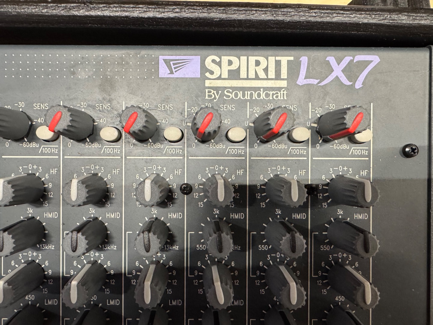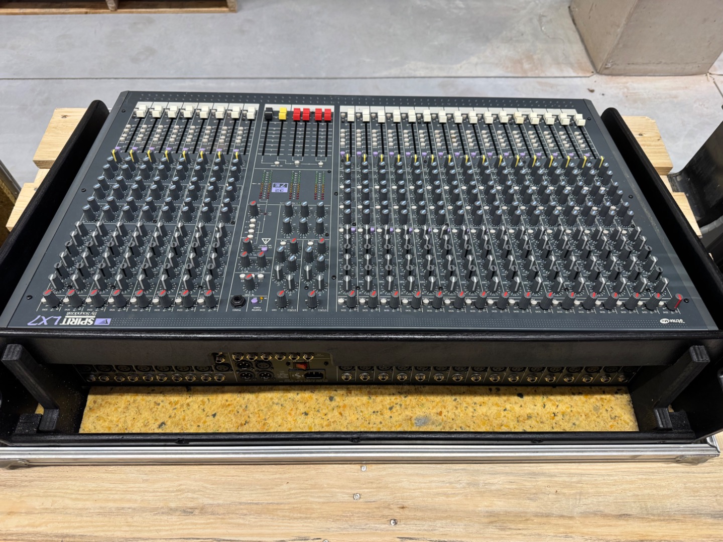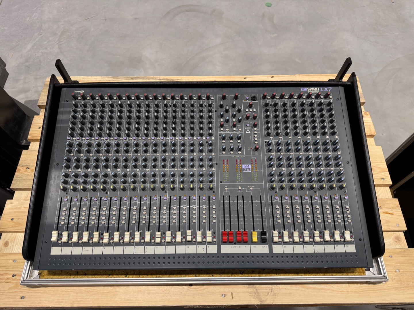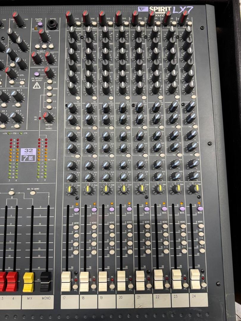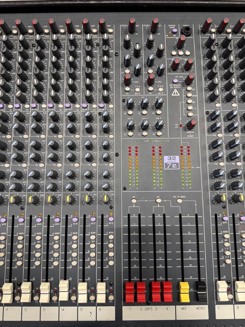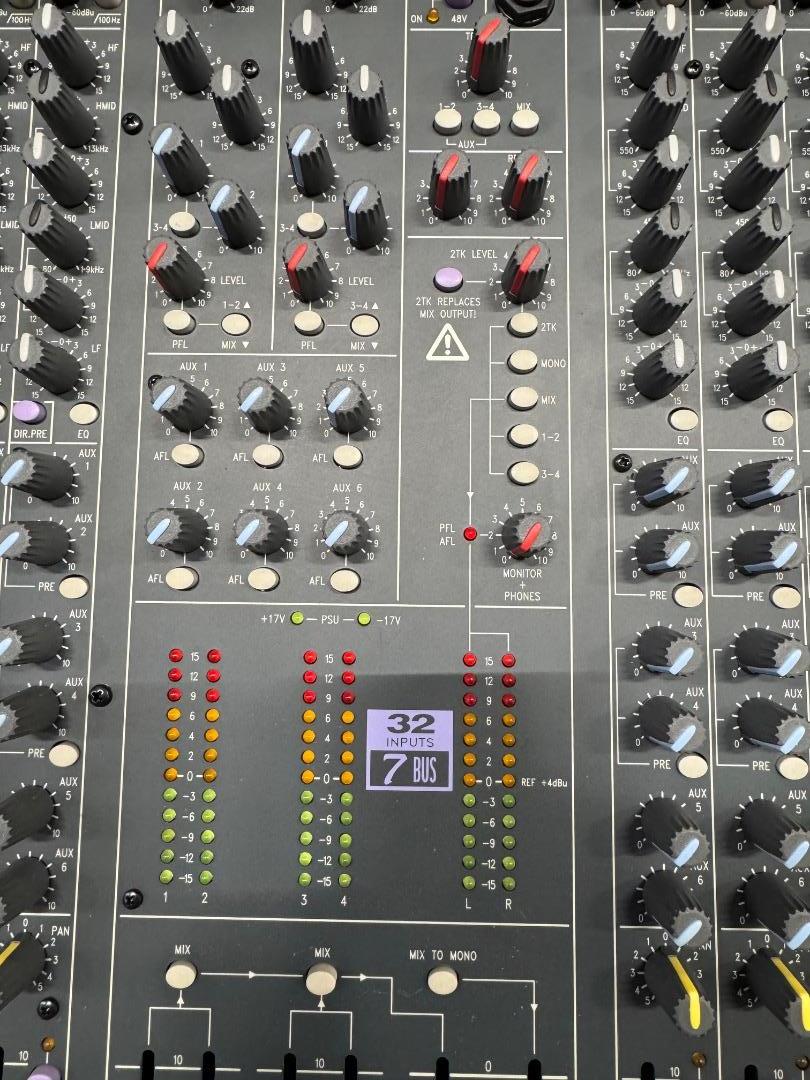 Durch neue Mikrofonvorverstärker wurde das Rauschverhalten auf ein Niveau gehoben, das in dieser Preisklasse bisher nicht möglich war. Die EQ sektion wurde ebenfalls aus den MH-Konsolen übernommen und ein wenig "abgespeckt". 32-Kanal Pult. Durch 2 Stereoeingänge und 2 Stereo Returns stehen nochmal 8 zusätzliche Eingänge zur Verfügung. Jeder Kanalzug ist mit einer 4-Band EQ mit 2 durchstimmbaren Mitten, 18dB/Oct. Trittschallfilter, 6 Aux Sends (4 pre/post schaltbar), einer Insertbuchse und pre/post schaltbaren Direct Out (Kanäle 1-24) ausgestattet. Routing Schalter zu den 7 Ausgangsbussen, Mute- & PFL Funktion, Panorama Regler, 100mm Fader sowie eine Übersteuerungsanzeige. Der Talkbackeingang lässt sich auf die Aux Sends 1-4 und die Stereosumme routen. PFL-/AFL Pegel werden auf 6 12-Segment LED Ketten angezeigt. Das Netzteil ist im Pult integriert.