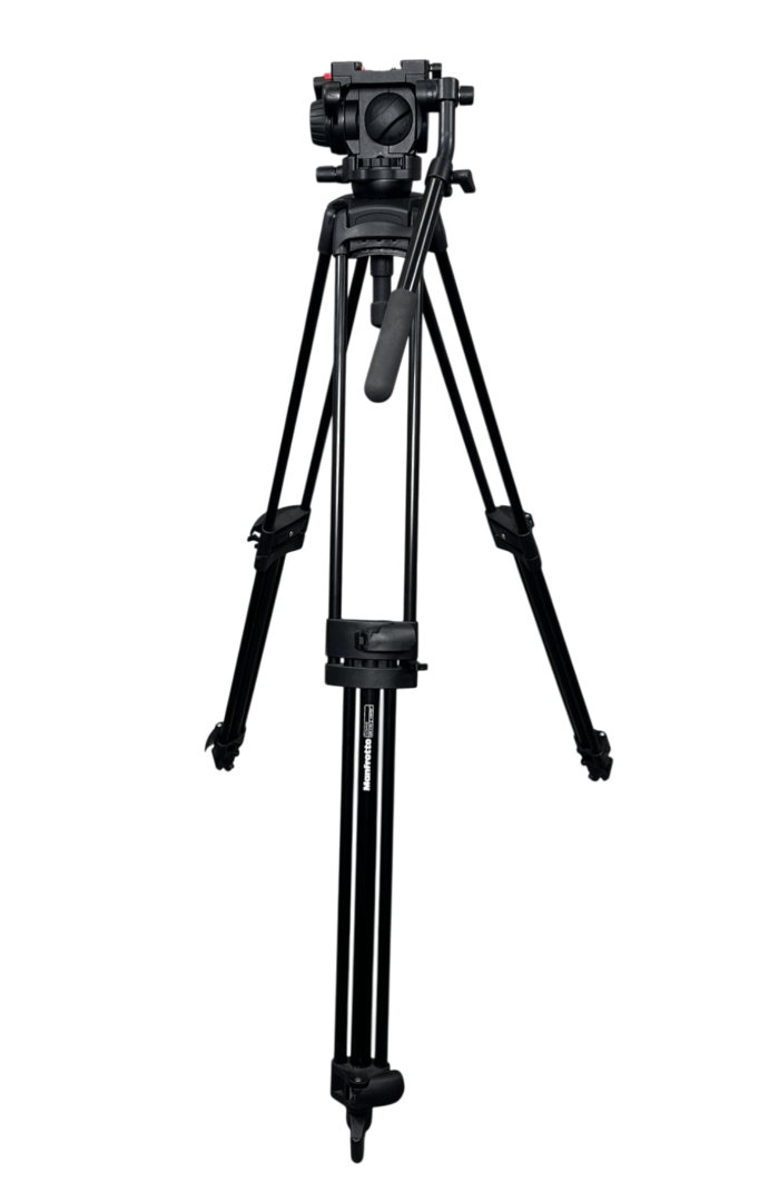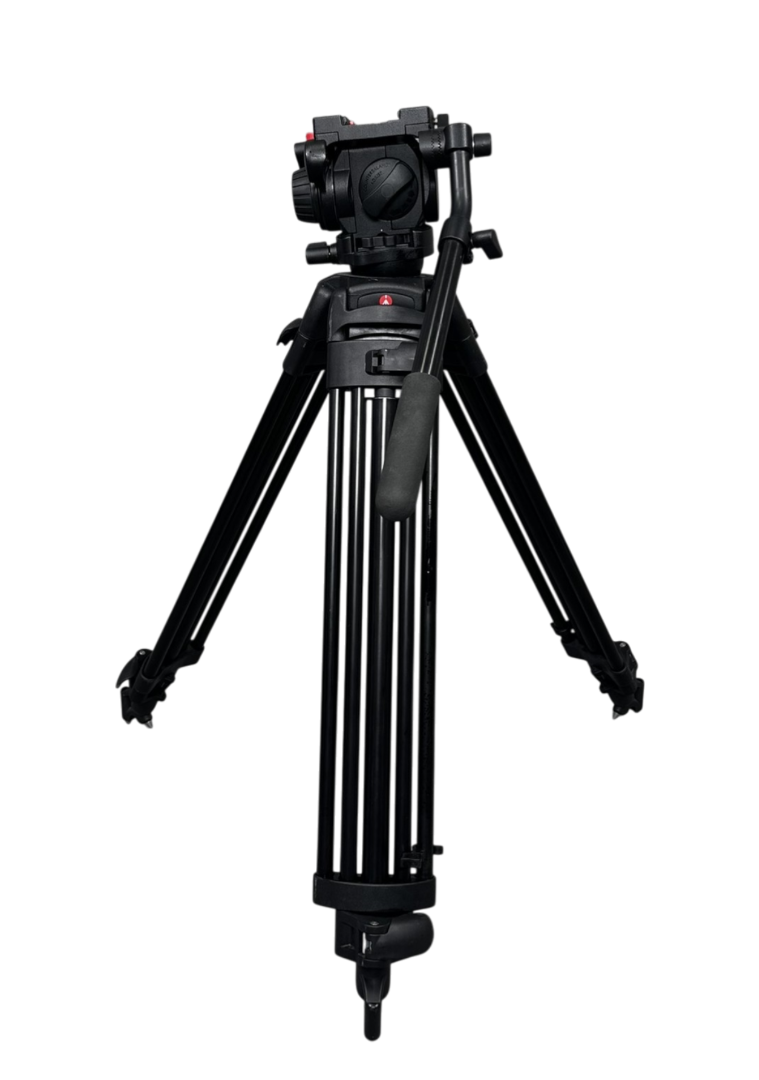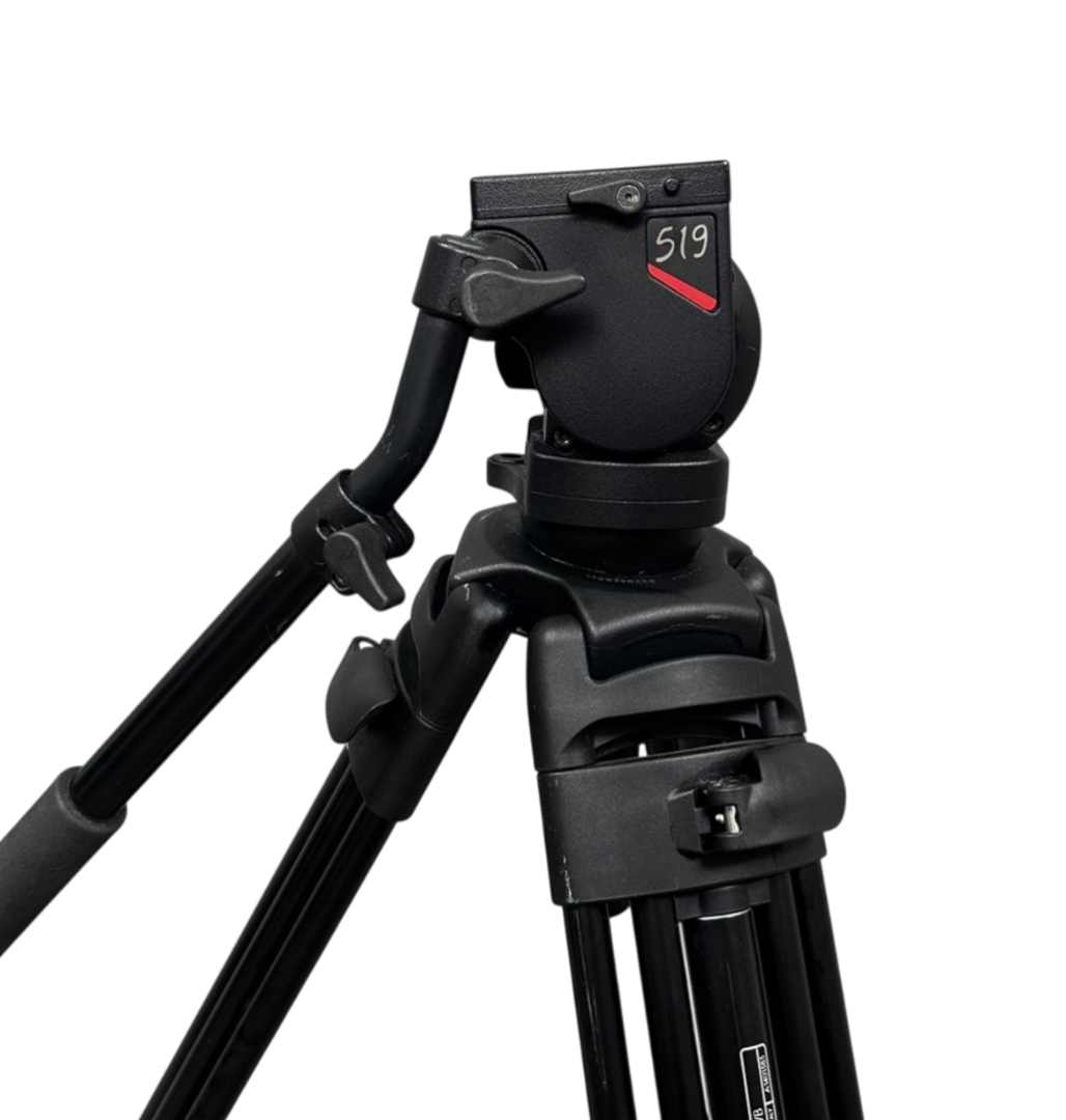 Zum Verkauf steht ein Manfrotto 519 Video-Stativsystem (M525MVB), bestehend aus Fluidkopf, Aluminium-Stativ und Transporttasche.