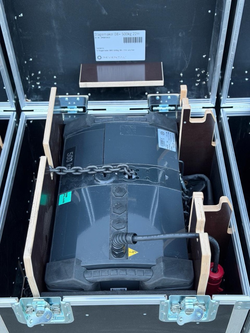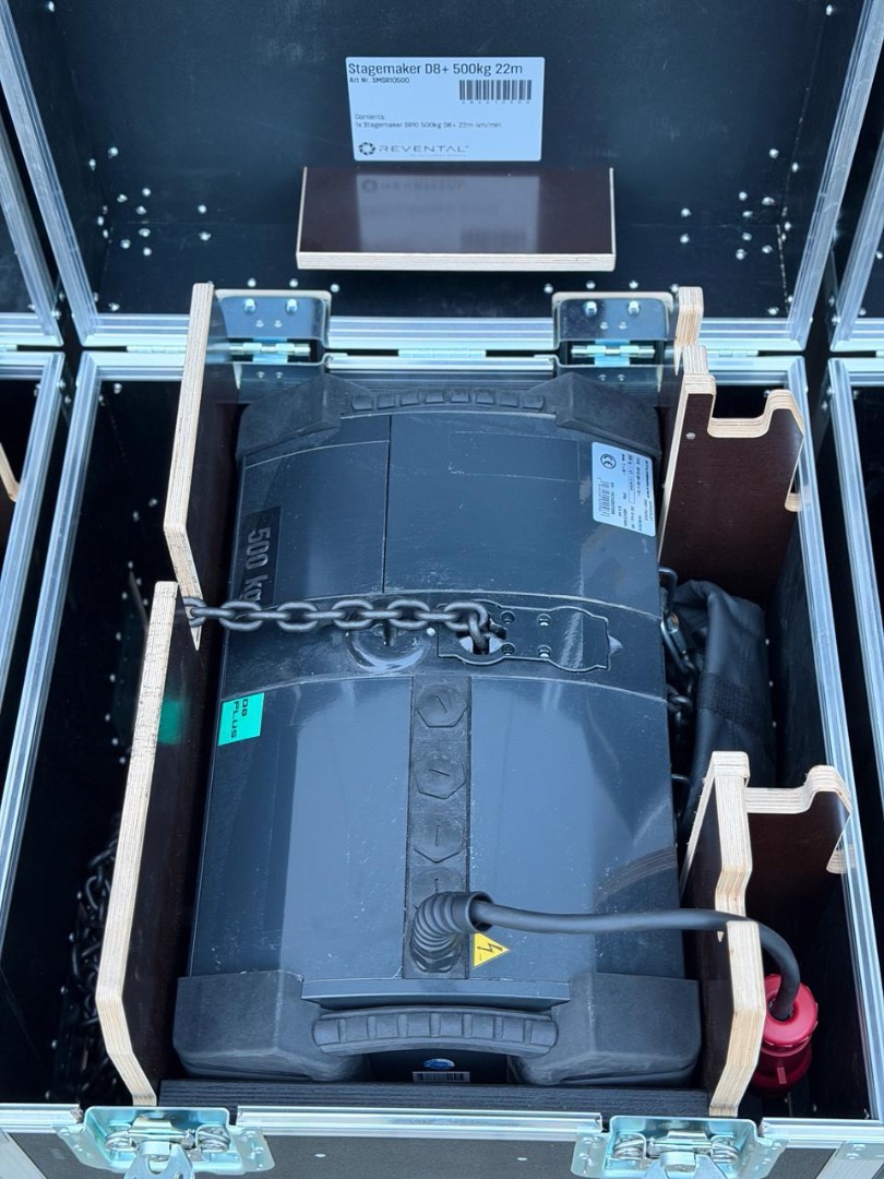 We are selling used Stagemaker D8+ 500kg hoists with 22m chains, including cases.