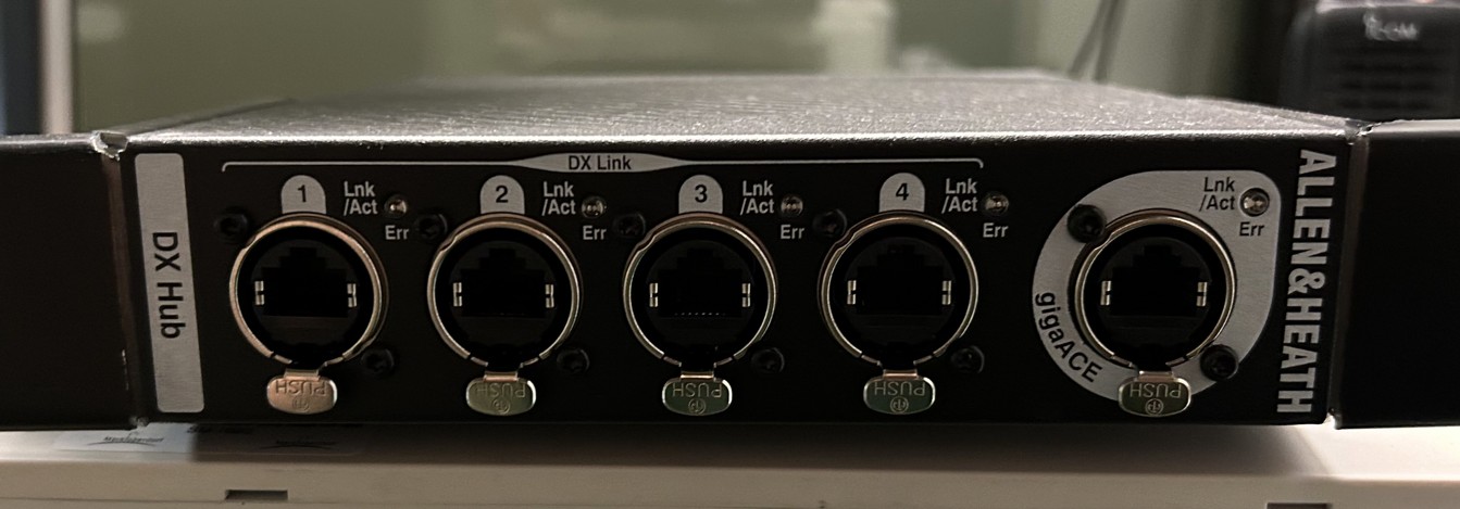 Der DX Hub kann über SLink mit jedem AHM-, SQ-, Qu*- oder Avantis-Mischpult oder mit jedem Avantis-Mischpult oder dLive-System mit gigaACE I/O-Modul verbunden werden.