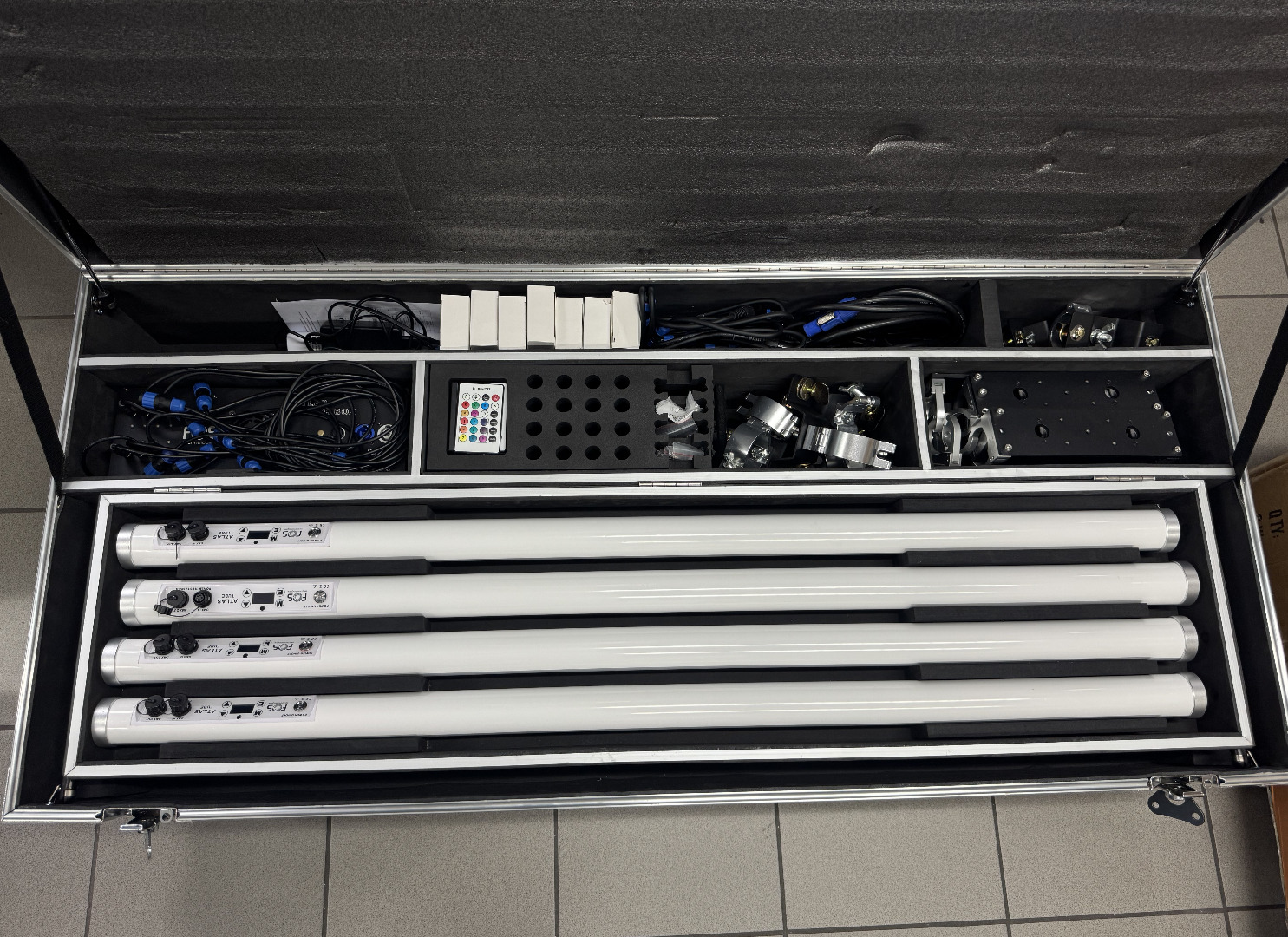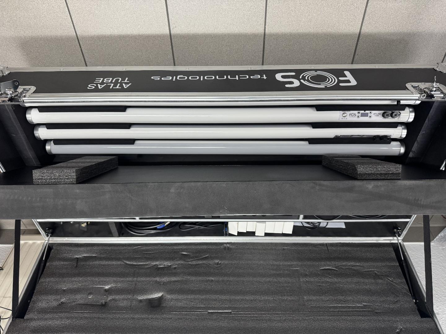 Zum Verkauf steht ein komplettes 8er-Set FOS Atlas Tube LED-Sticks im WDMX Tourset – ähnlich Astera – direkt vom Fachhändler. Das Set ist vollständig ausgestattet mit Ladecase, Standfüßen, Clamps, Netzteilen, XLR-Adaptern und WDMX. Die Leuchten sind in sehr gutem Zustand, das Case weist Gebrauchsspuren auf – technisch einwandfrei.