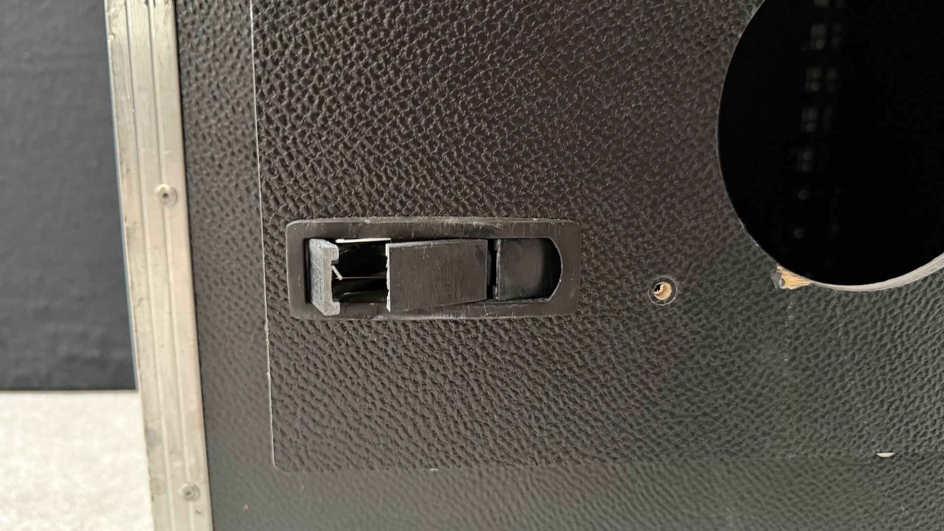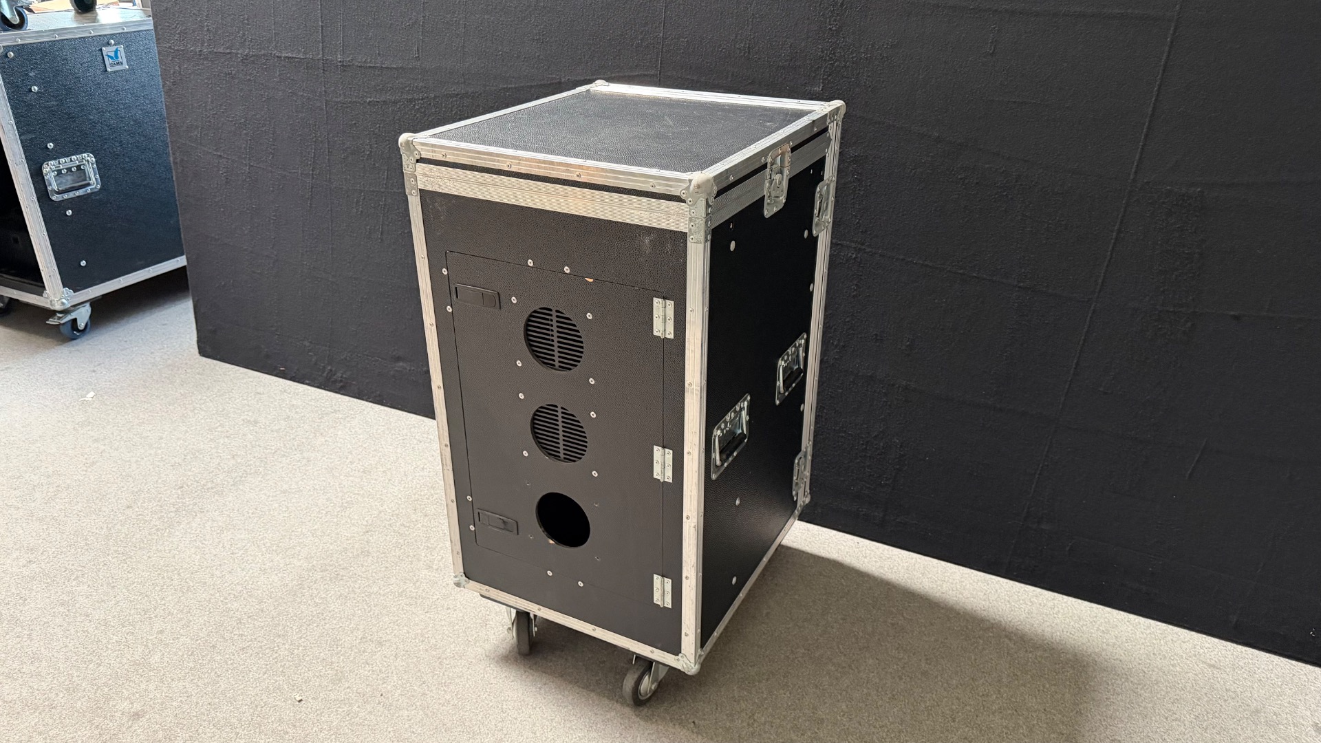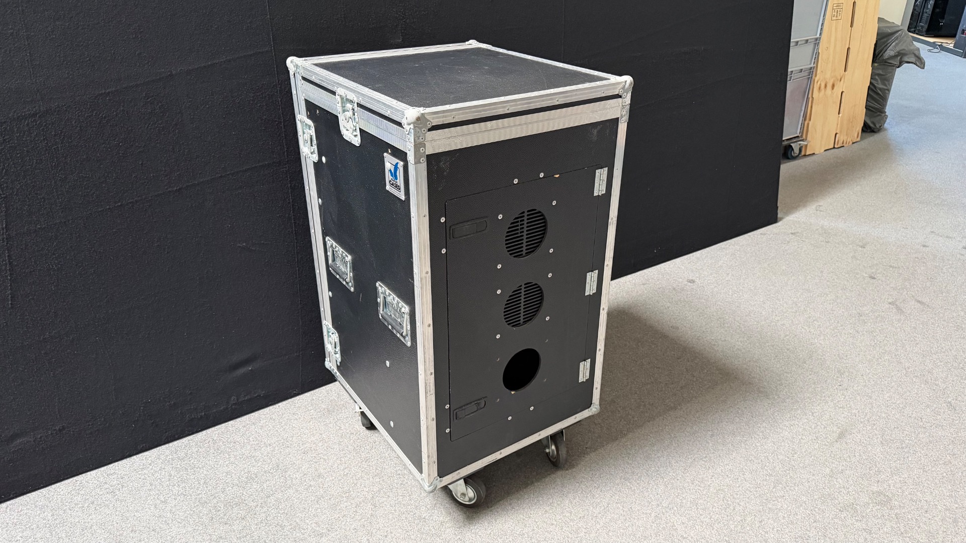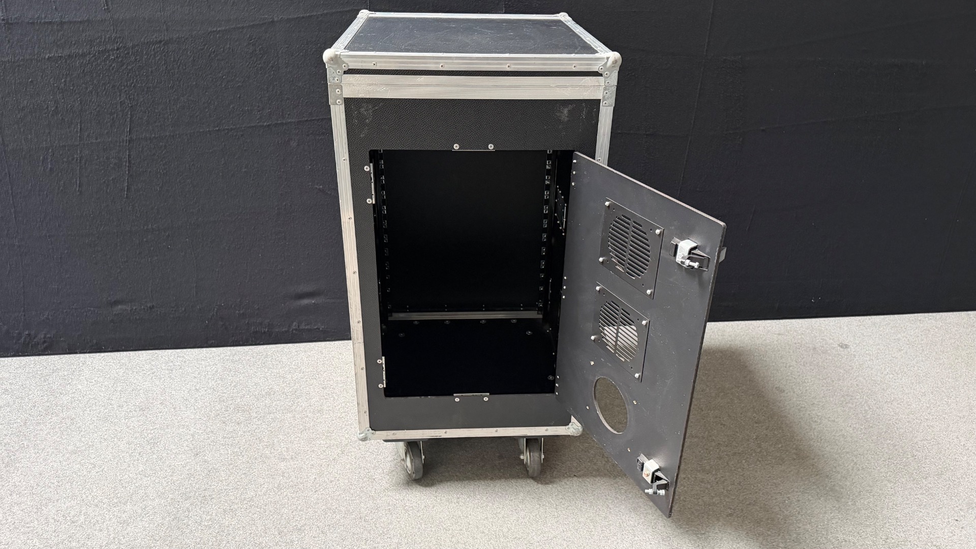 In der Tür befindet sich noch eine Lüftungsaussparung ohne Lüftungsgitter und der untere Verschluss ist leider gebrochen. Ansonsten befindet sich das Rack in einem guten, wenig gebrauchten Zustand.