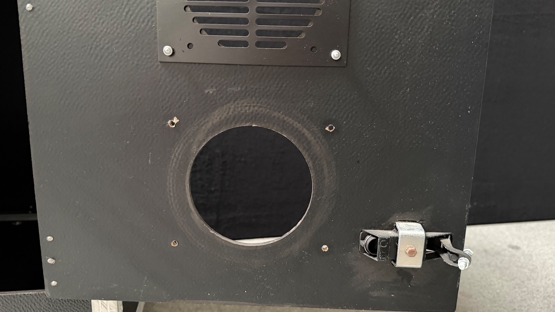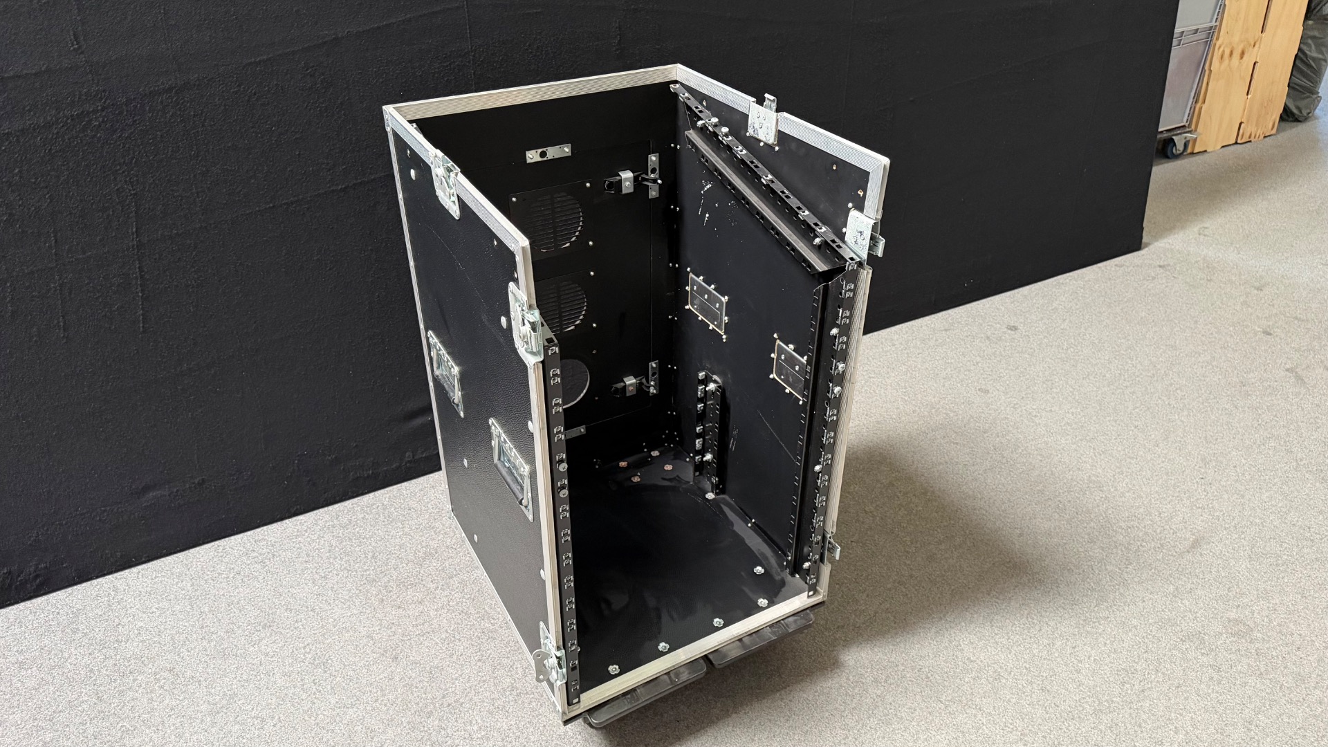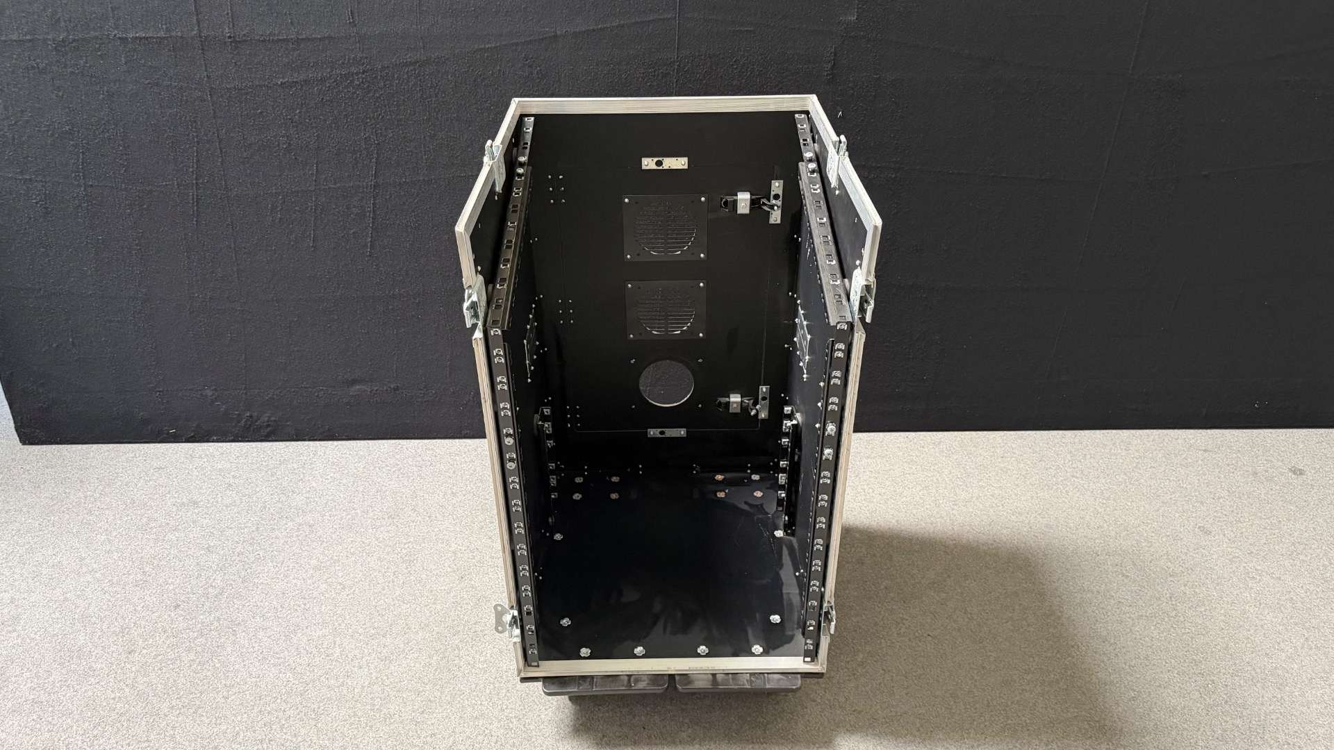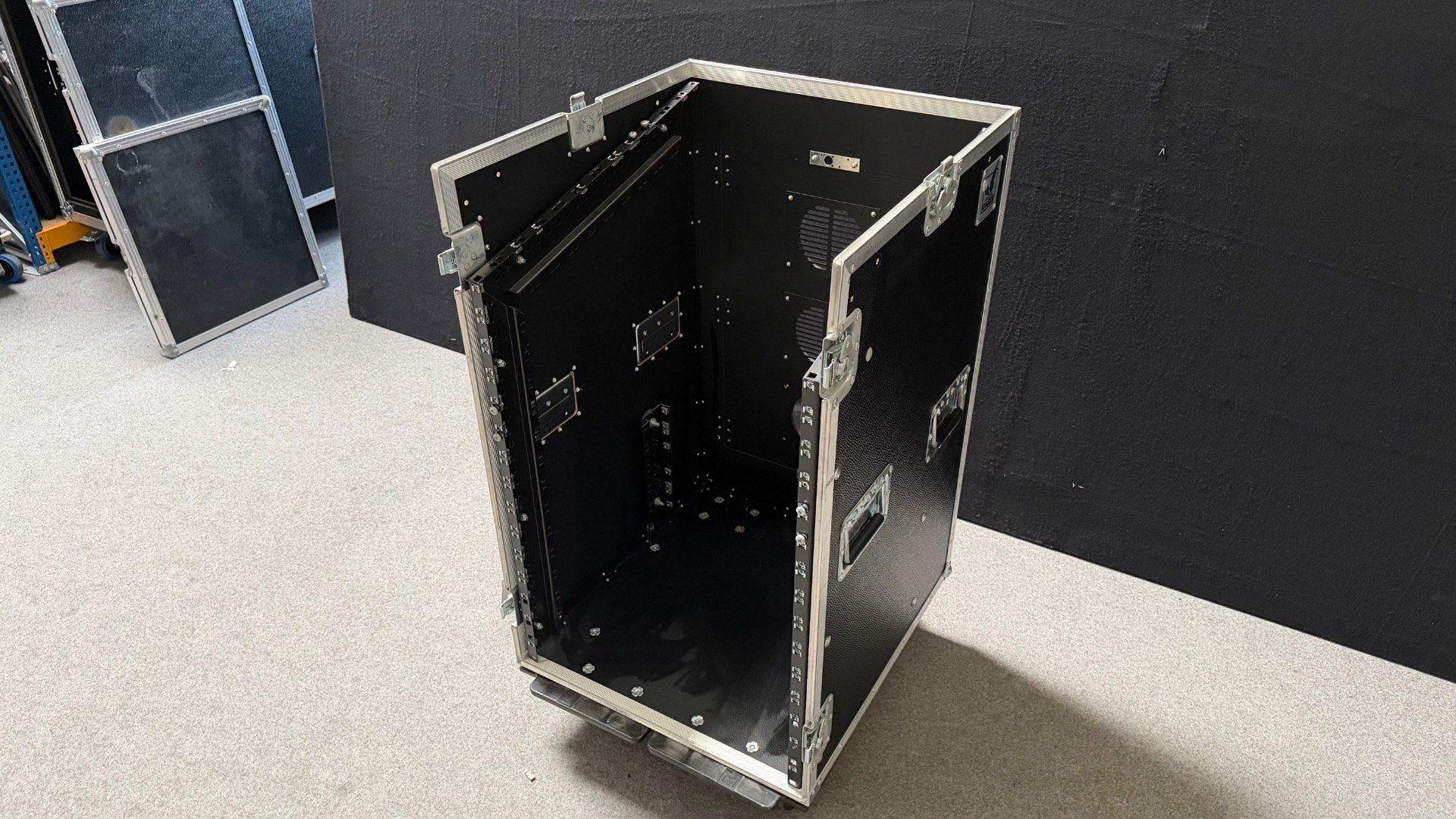 In der Tür befindet sich noch eine Lüftungsaussparung ohne Lüftungsgitter und der untere Verschluss ist leider gebrochen. Ansonsten befindet sich das Rack in einem guten, wenig gebrauchten Zustand.