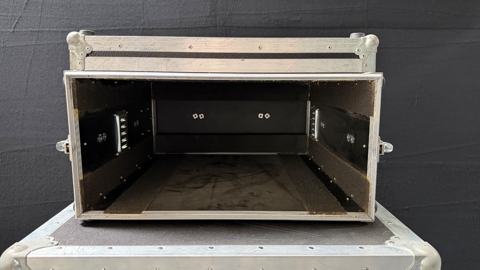 Das Case befindet sich optisch und technisch in einem guten Zustand, es sind nur ein paar Klebereste und Kratzer dran. Innen ist das Rack leer, die Deckel sind mit einen Schaumstoffstreifen ausgestattet. Ein Gummifuß fehlt leider!
