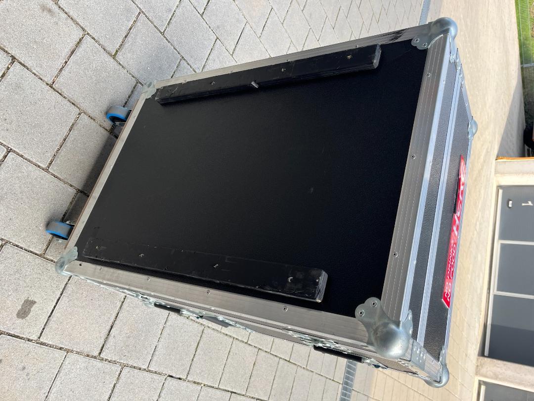 Stabiles Case mit 6 Griffen, Rollen, sodass die Haube hinter dem Pult stehen kann, ordentlich gepolstert, mit Dog-House für Steckdosenleiste und Router etc.
