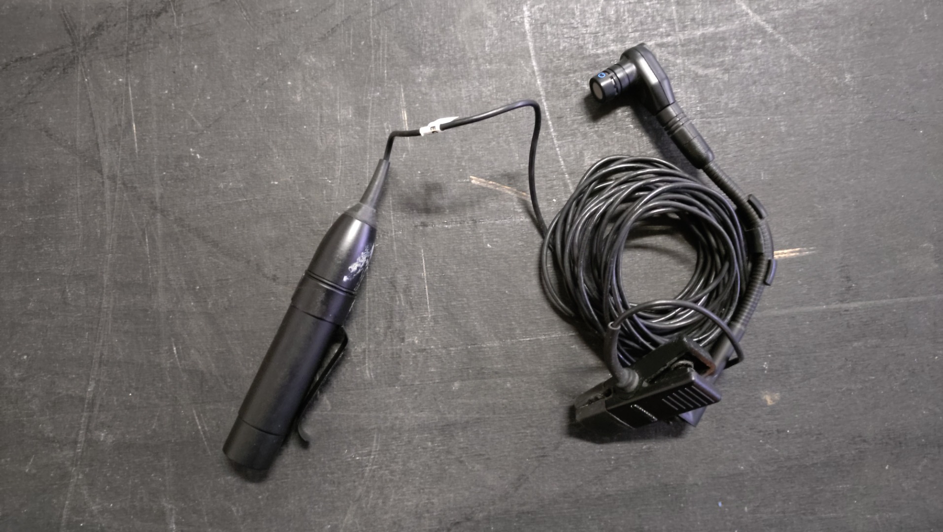 Die Mikrofone sind voll funktionsfähig und haben dem Alter entsprechende Gebrauchsspuren. Die Windschutze ist nicht mehr vorhanden. An einem der Mikrofone ist die Kabelabdeckung an der Klemme leicht beschädigt, das Mikro funktioniert aber.