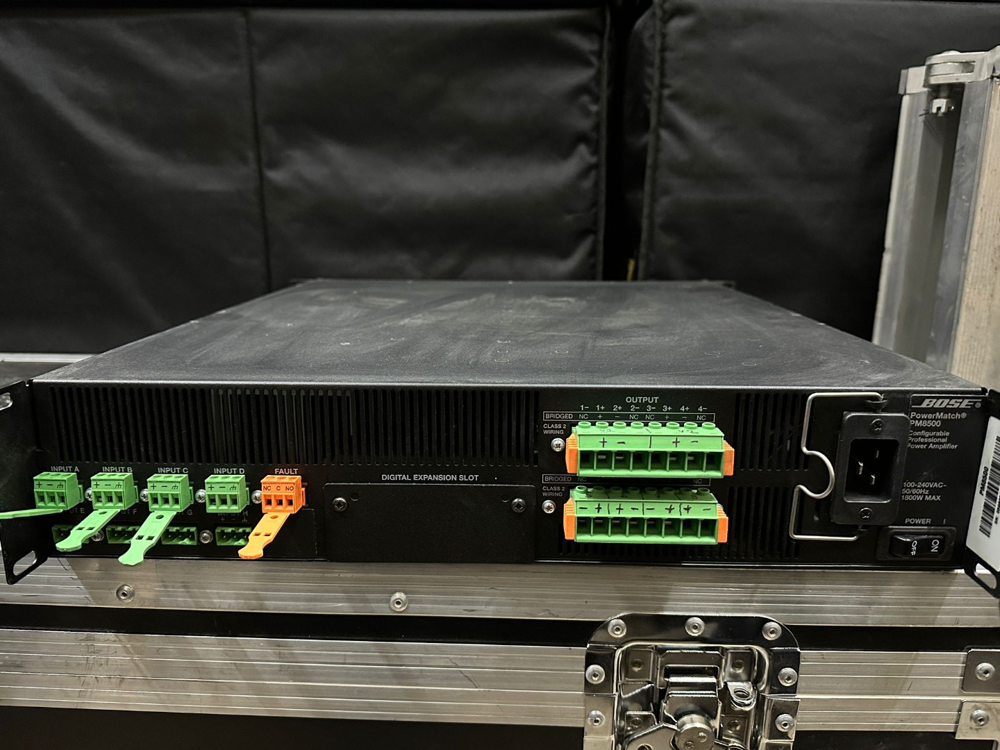 The Bose® PowerMatch PM8500 configurable professional power amplifier provides concert-quality sound with a high level of scalability and configurability. The PM8500 offers multiple channel and power options, an integrated audio DSP, front panel interface and USB connection. Ethernetequipped versions enable network configuration, control and monitoring. An expansion slot supports inputs from optional digital accessory cards. PowerMatch amplifiers utilize numerous Bose technologies to deliver an unprecedented combination of performance, efficiency and ease of installation—all in a reliable, proprietary design. Available in two versions, the PM8500 provides USB connection for single-unit setup and control using Bose ControlSpace® V3.0 or higher software.