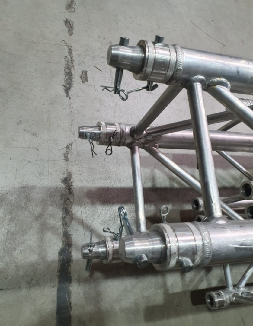 Die Traversen werden einseitige mit konischem Verbinder, Pins und Splinte bestückt.