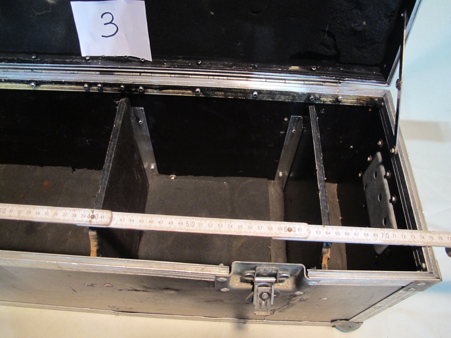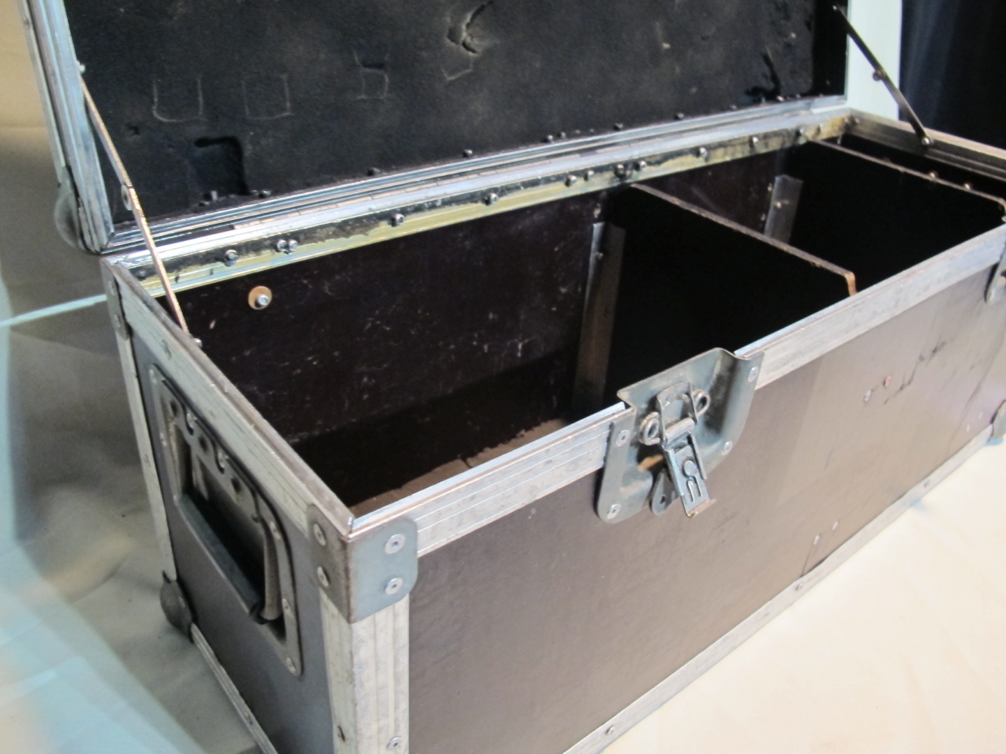 Das Koffercase / die Werkzeugkiste hat ein Tourlabel und 3 Fächer wobei die Trennbretter entfernt werden können. Das Flightcase hat zwei Deckelaufsteller, 2 Klappgriffe, 2 mittlere Catches und hinten ein Klavierband sowie das Tourlabel.