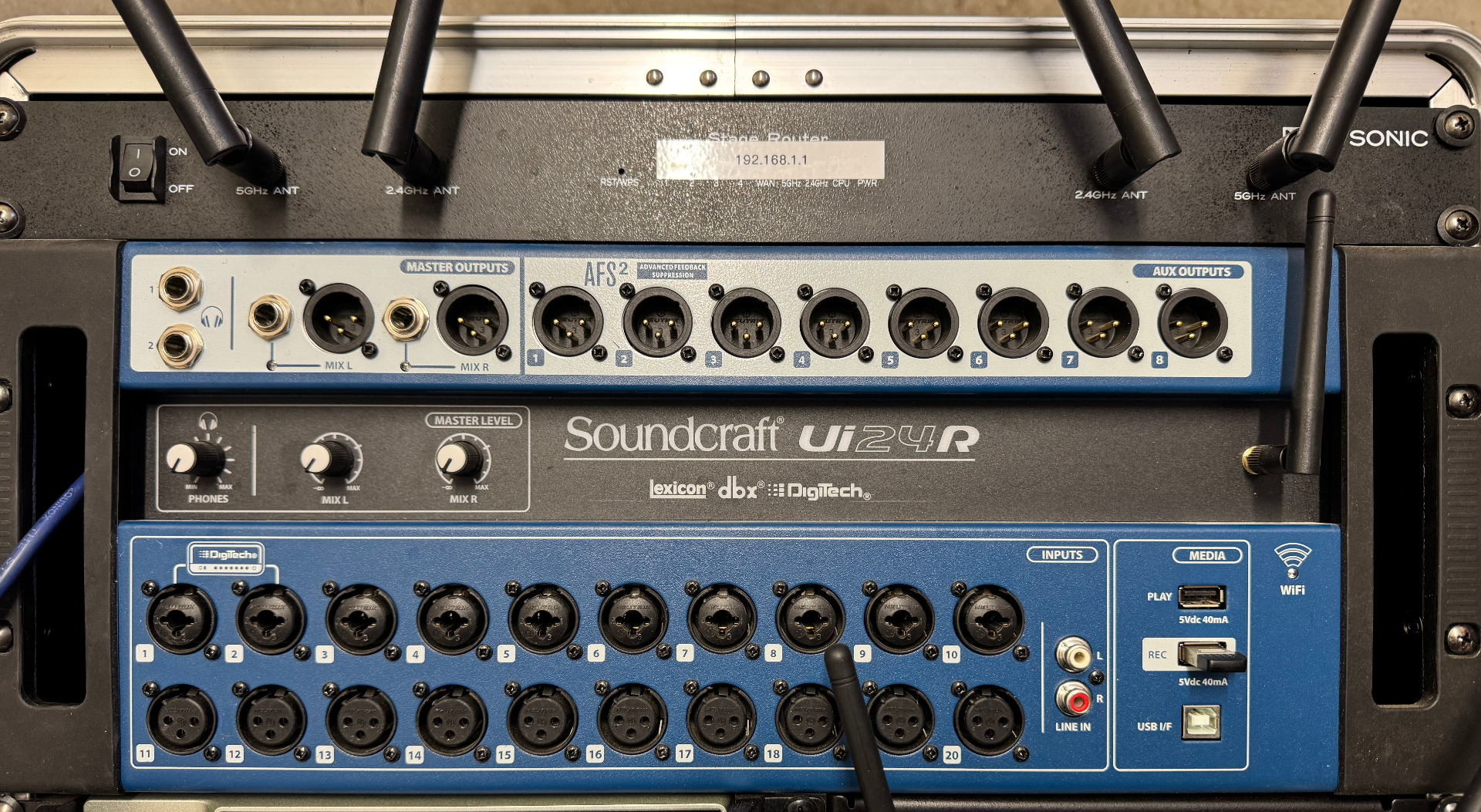 Alles komplett verkabelt, wie auf den Bildern zu sehen. Die Ubiquiti Antenne kann auch gern dazu gekauft werden. Diese wird per PoE-Buchse aus dem Case versorgt. Beste WLAN Qualität im FoH.