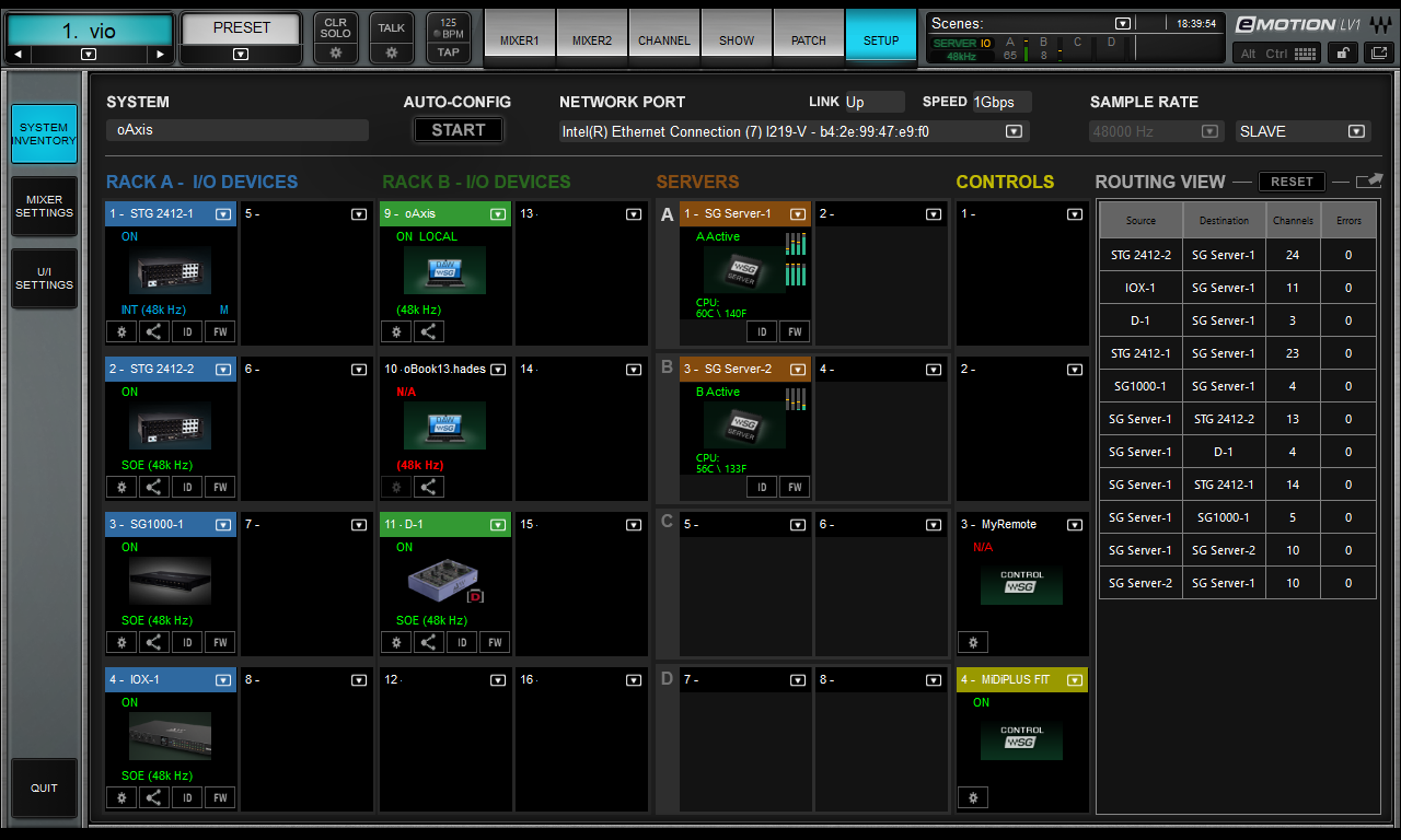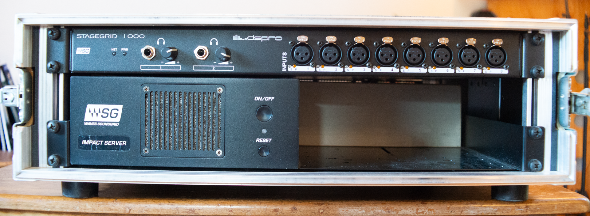 - 1x Waves Server Impact V4 und Stagegrid 1000 (8x Preamps, 2 AES Inputs, 4 analoge Outputs, 2 AES Outputs, 2 Headphone) mit eingebautem Netgear GS105 Switch