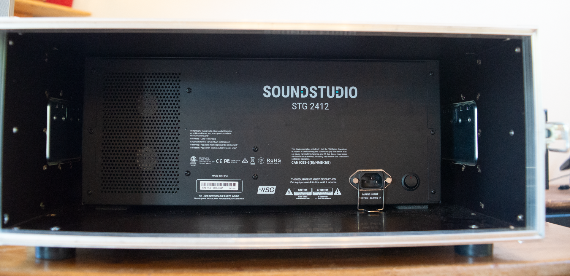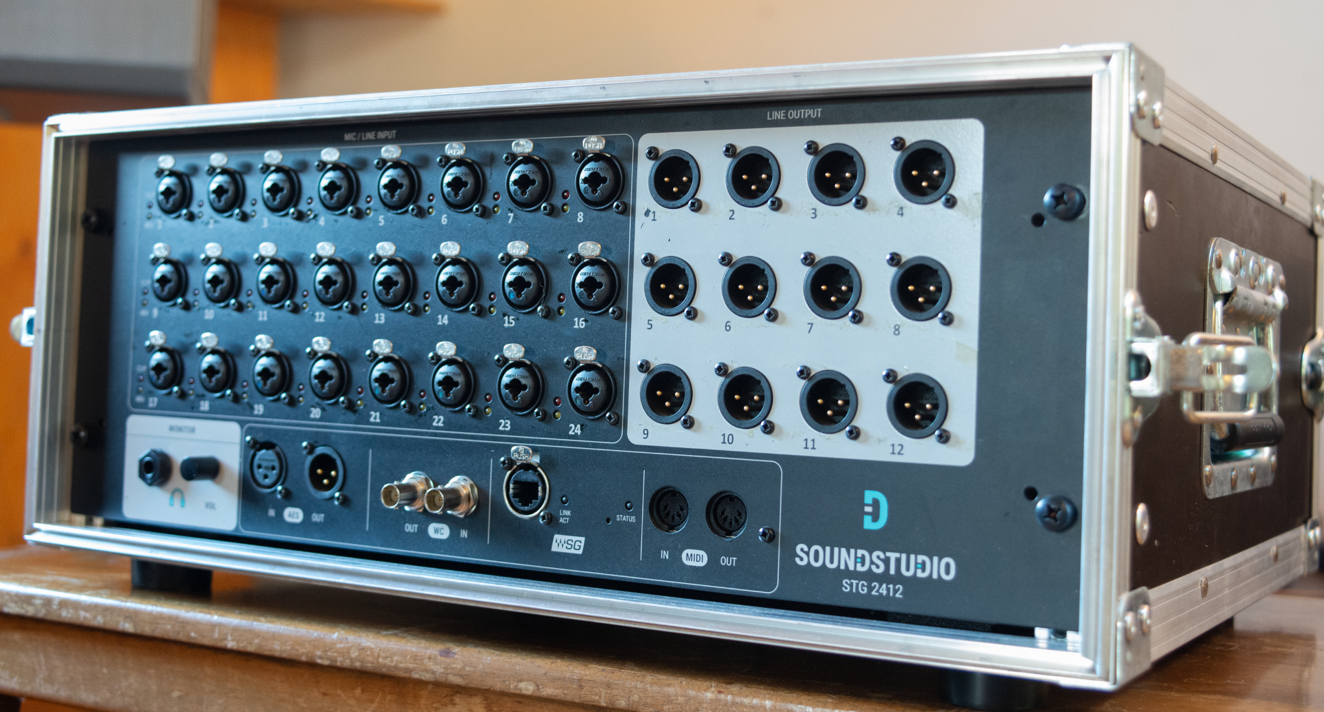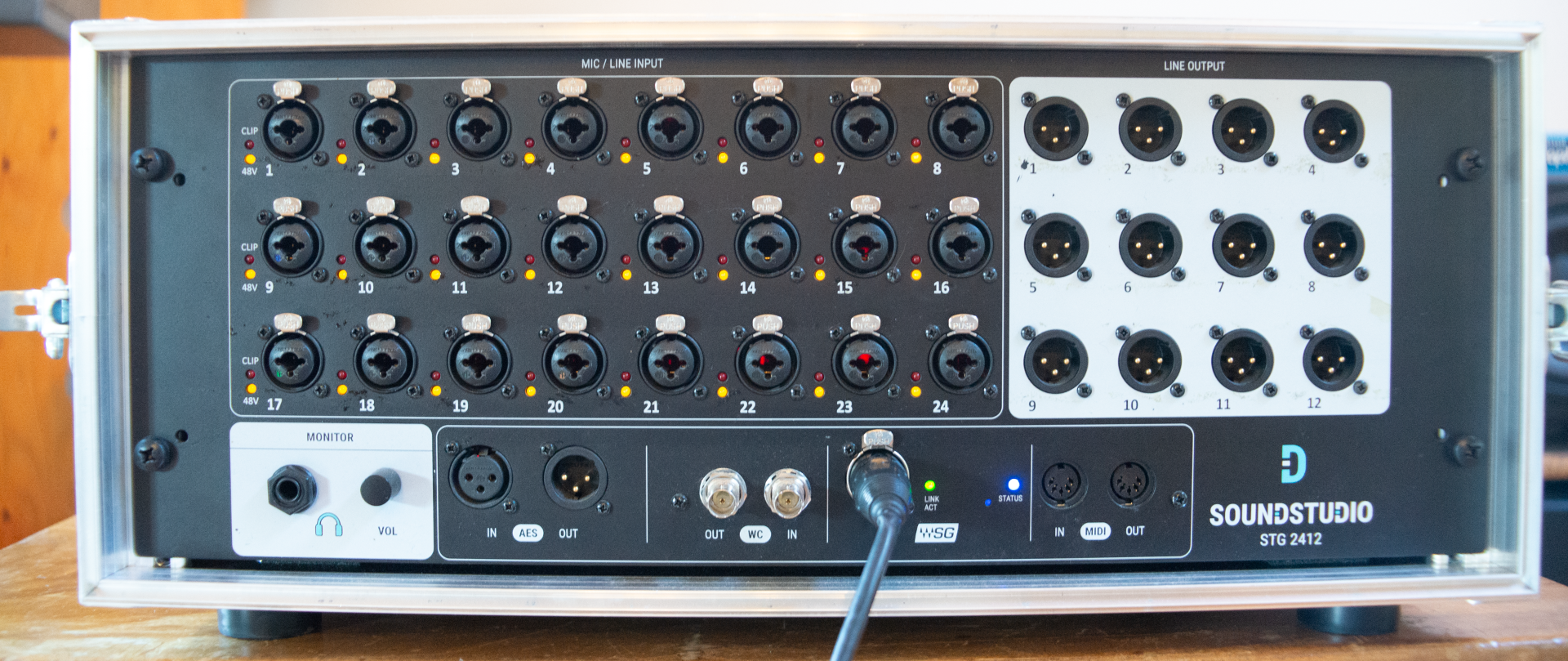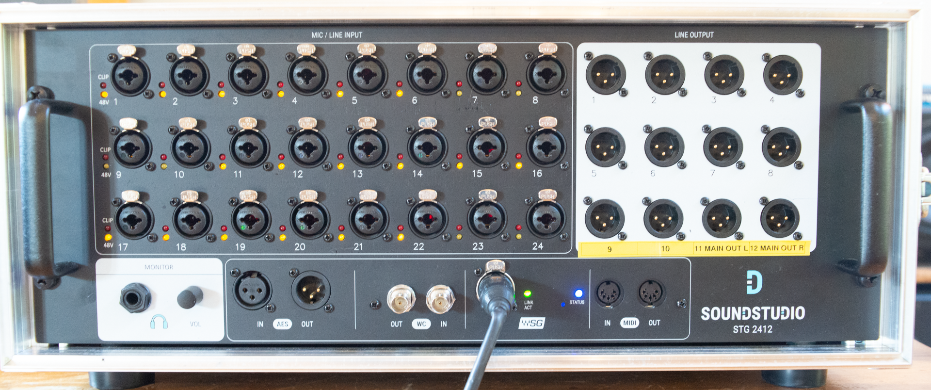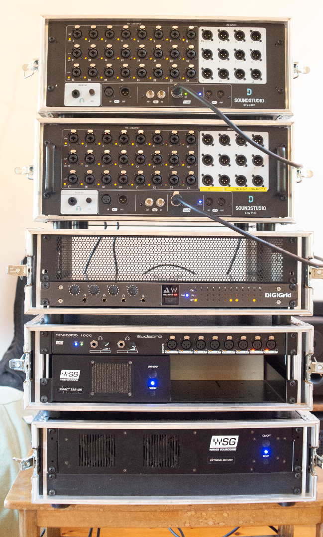 - 2x Soundstudio STG-2412 (24x Kombi-Preamps, 2 AES Inputs, 12 analoge Outputs, 2 AES Outputs, 1 Headphone) in jeweils einem 4HE Case